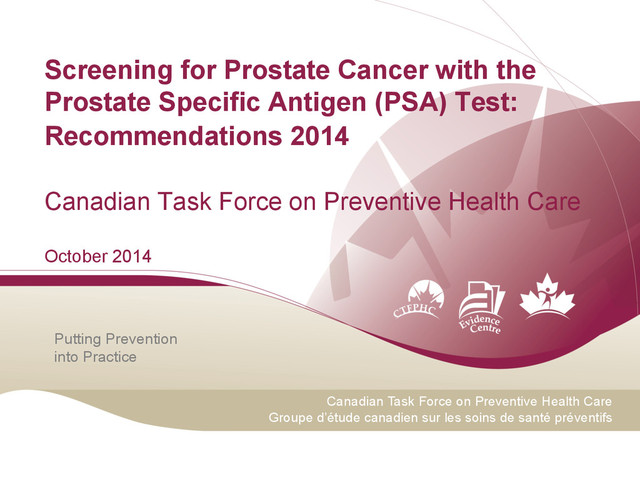 Care Groupe d’étude canadien sur les soins de santé préventifs Screening for Prostate Cancer with the Prostate Specific Antigen (PSA) Test: Recommendations 2014 Canadian Task Force on Preventive Health Care October 2014