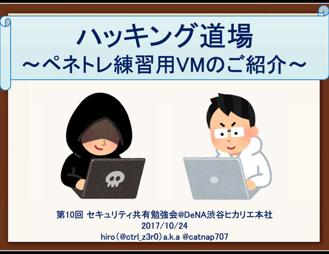 2007/02/28 De-ICE S1.110 nmap、ftp、strings、john、hydra 1:易しい 2007/03/20 De-ICE S1.120 nmap、sqlmap、john、hydra 1:易しい 2011/03/30 De-ICE S1.123 netdiscover、nc(netcat) 1:易しい 2009/10/12 De-ICE S1.130 netdiscover、nmap、hydra、openssl 3:難しい 2011/03/30 De-ICE S1.140 nmap、john、hydra (ブートしなかった) 2013/10/10 De-ICE S2.100 netdiscover、ftp、dirb、john 1:易しい 2008/01/16 http://hackingdojo.com/dojo-media/