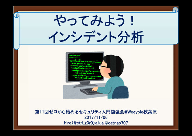 やってみよう! インシデント分析 第11回ゼロから始めるセキュリティ入門勉強会@Weeyble秋葉原 2017/11/06 hiro(@ctrl_z3r0)a.k.a @catnap707