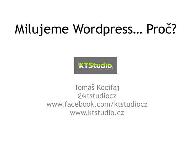 Milujeme Wordpress… Proč? Tomáš Kocifaj @ktstudiocz www.facebook.com/ktstudiocz www.ktstudio.cz