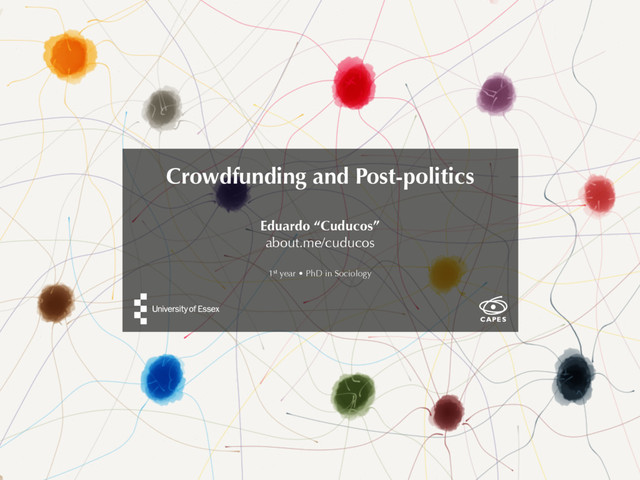Digital Distribution. Basingstoke: Palgrave Macmilllan. Barry, A. (2002). The Anti-political Economy. Economy and Society, 31(2). Pp. 268-284. Bennett, E. A., Cordner, A., Klein, P. T. and Baiocchi, G. (2013). Disavowing Politics: Civic Engagement in an Era of Political Skepticism. American Journal of Sociology, 119(2). Pp. 518-548. Boltanski, L. and Chiapello, E. (2005). The new spirit of capitalism. London: Verso. Borch, C. (2012). The Politics of Crowds: An Alternative History of Sociology. Cambridge: Cambridge University Press. Mouffe, C. (2005). On the Political. London: Routledge. Papacharissi, Z. (2009). The Virtual Sphere 2.0: The internet, the public sphere, and beyond. In A. Chadwick & P. N. Howard (eds.). Routledge Handbook of Internet Politics. London and New York: Routledge. Pp. 230-245. Ritzer, G. and N. Jurgenson (2010). Production, Consumption, Prosumption: The nature of Capitalism in the Age of the Digital ‘Prosumer.’ Journal of Consumer Culture, 10(1). Pp 13-36. Schedler, A. (1997). Introduction: Antipolitics – Closing and colonizing the public sphere. In Schedler, A. (ed.) The end of Politics? Explorations into modern antipolitics. New York: Macmillan. Pp. 1-20. Taylor, S. and Land, C. (2014). The Good Old Days Yet to Come: Postalgic times for the new spirit of capitalism. Management & Organizational History, 9(2). Pp 202-219. This presentation “Crowdfunding and Post-politics” by Eduardo Cuducos is licensed under a Creative Commons Attribution-ShareAlike 4.0 International License.