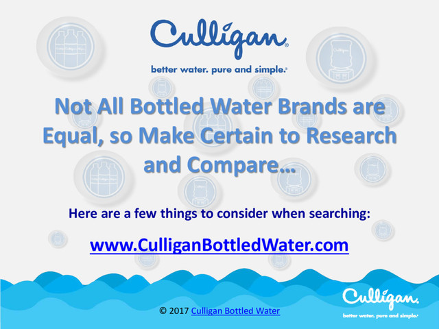 Best Quality Water • We have been the trusted leader in providing bottled drinking water solutions to homes & businesses for more than 80 years. • Our water is produced under strictly monitored processing & bottling standards set forth by the IBWA, FDA & Culligan. • We are committed to providing top-quality bottled drinking water and water delivery to our customers. We guarantee it!