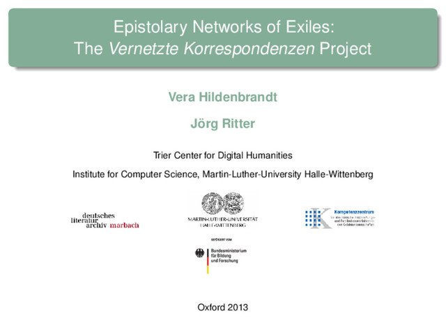 Thomas Mann, Klaus Mann, René Schickele, Stefan Zweig, Joseph Breitbach, Joseph Roth, Alfred Döblin, Franz Schoenberner, Gottfried Bermann-Fischer, Julius Meier-Graefe, Siegfried Kracauer, Annette Kolb Where? France: Paris, Maisons-Laffitte, Sanary-sur-Mer, Roquebrune-Cap Martin, Nice-Fabron Belgium: Ostende Austria: Salzburg Switzerland: Zurich, Rapperswil UK: London USA: Los Angeles Netherlands: Zandvoort ... When? Dec, 12th 1933 – Mar, 6th 1943 What about? ... Hildenbrandt, Ritter (Uni Trier, MLU Halle) Vernetzte Korrespondenzen Oxford 2013 25 / 41