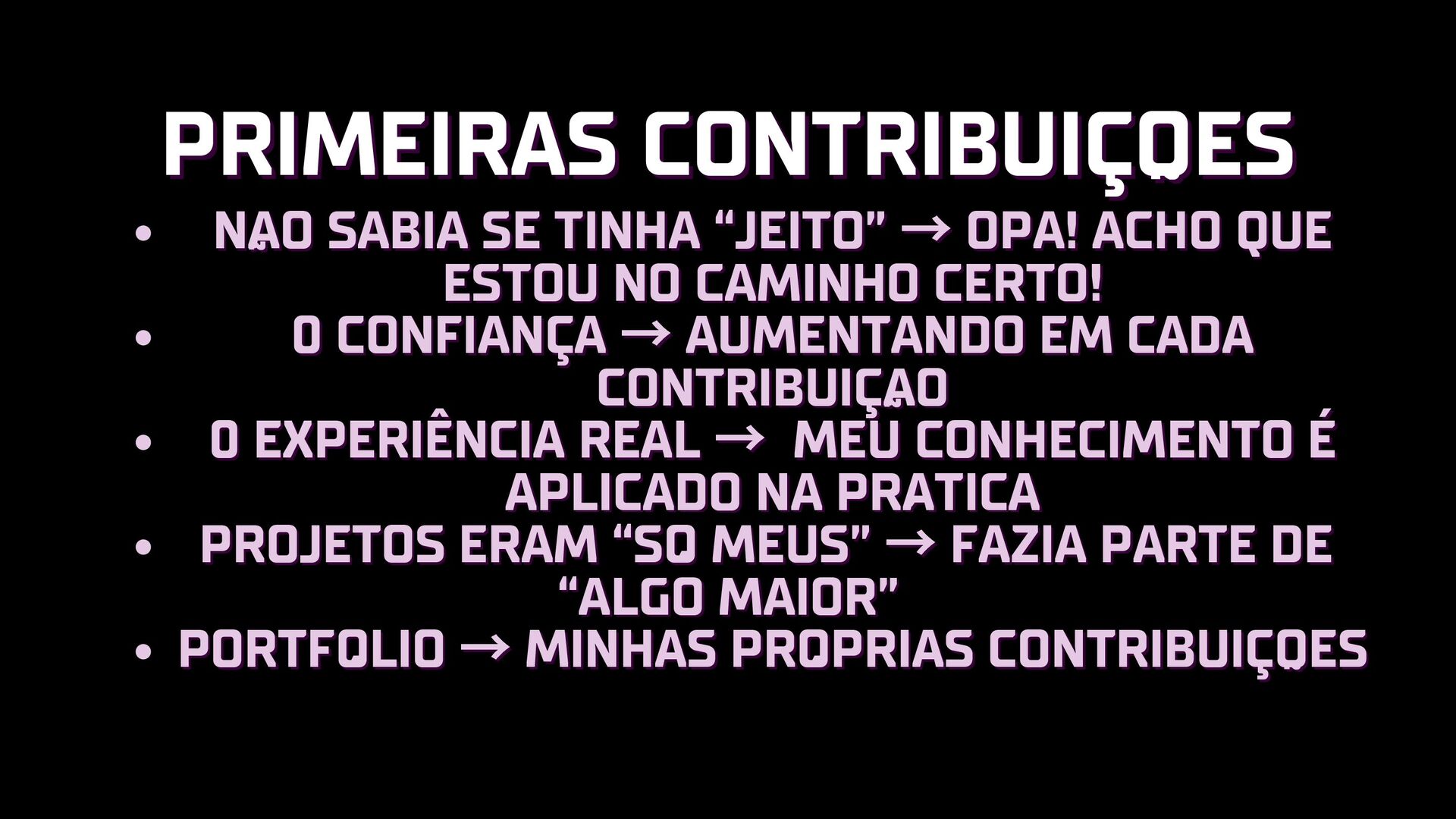 ACHO QUE ESTOU NO CAMINHO CERTO! CAMINHO CERTO! NÃO SABIA SE TINHA “JEITO” → NÃO SABIA SE TINHA “JEITO” → AUMENTANDO EM CADA AUMENTANDO EM CADA CONTRIBUIÇÃO CONTRIBUIÇÃO 0 CONFIANÇA → 0 CONFIANÇA → MEU CONHECIMENTO É MEU CONHECIMENTO É APLICADO NA PRÁTICA APLICADO NA PRÁTICA 0 EXPERIÊNCIA REAL → 0 EXPERIÊNCIA REAL → FAZIA PARTE DE “ALGO MAIOR” FAZIA PARTE DE “ALGO MAIOR” PROJETOS ERAM “SÓ MEUS” → PROJETOS ERAM “SÓ MEUS” → MINHAS PRÓPRIAS MINHAS PRÓPRIAS CONTRIBUIÇÕES CONTRIBUIÇÕES PORTFÓLIO → PORTFÓLIO →
