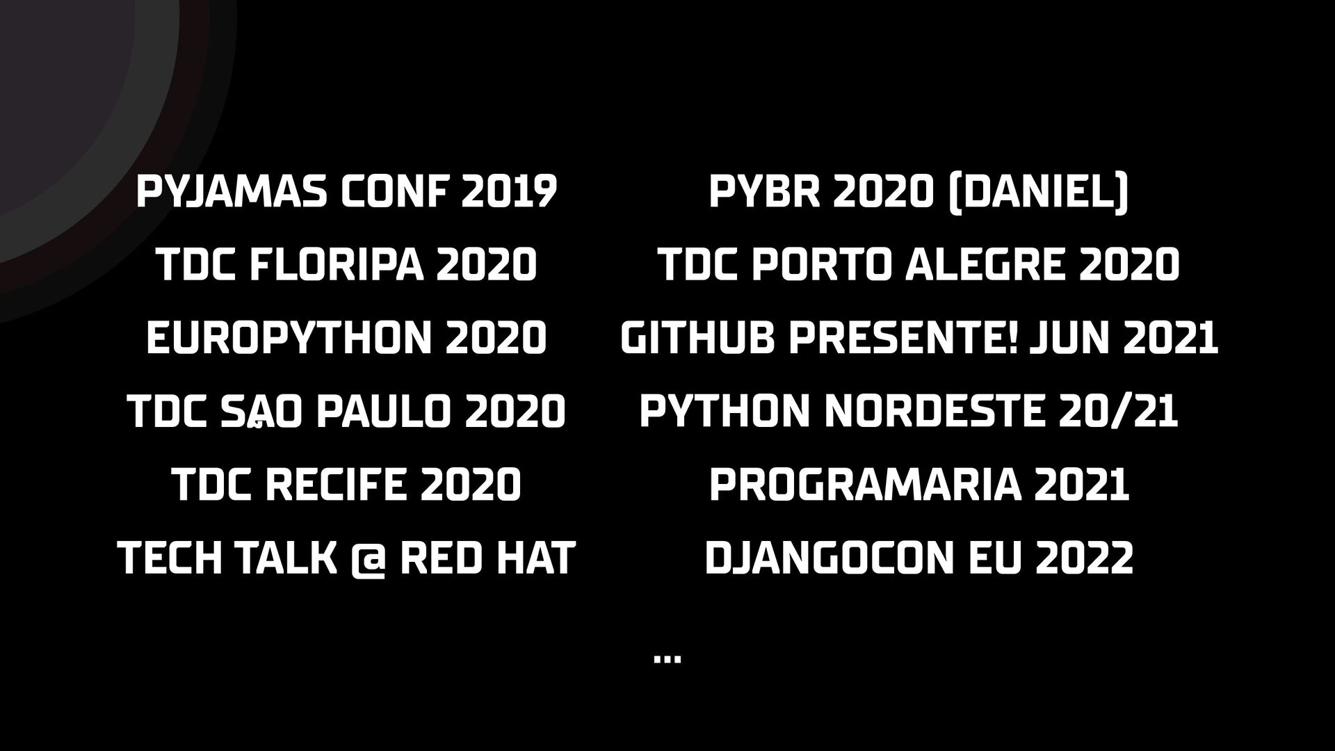 JUN 2021 TDC PORTO ALEGRE 2020 TECH TALK @ RED HAT TDC RECIFE 2020 TDC SÃO PAULO 2020 EUROPYTHON 2020 TDC FLORIPA 2020 PYJAMAS CONF 2019 PYBR 2020 (DANIEL) ...