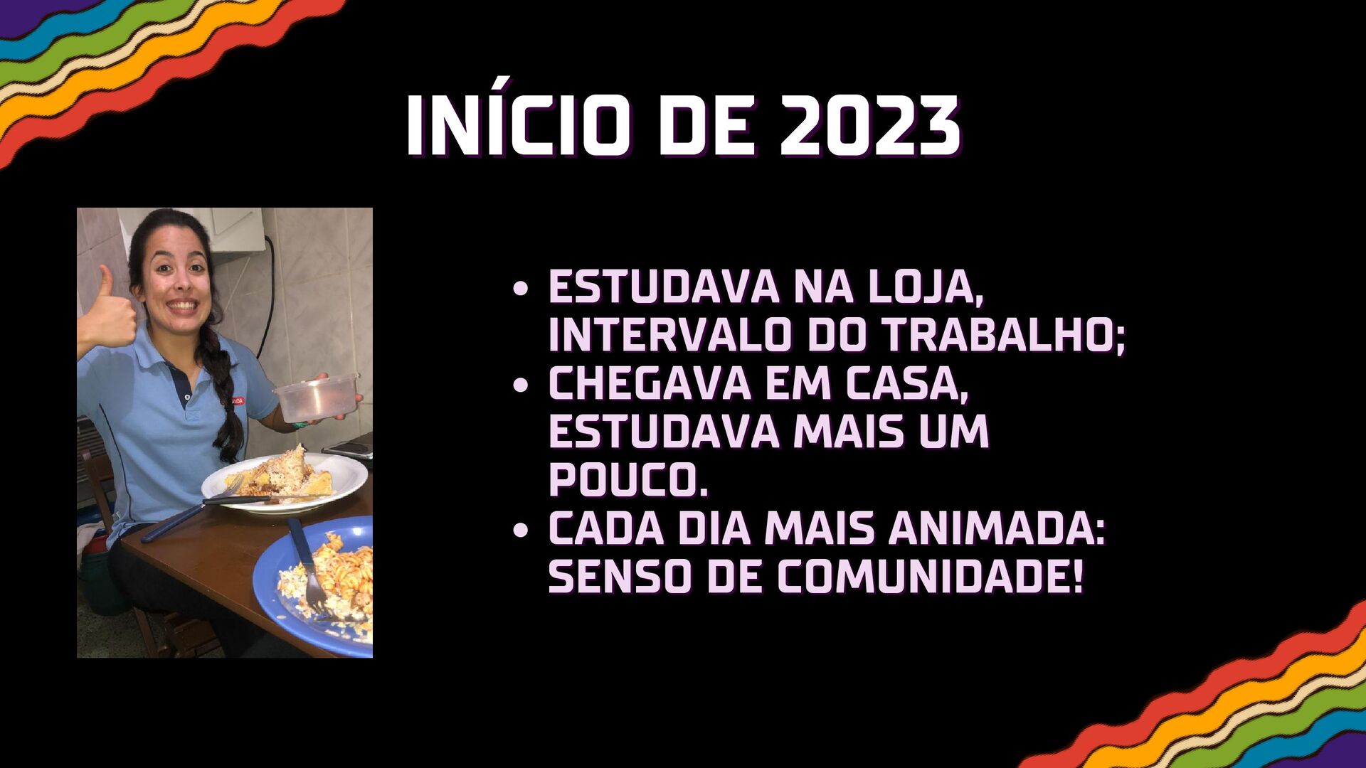 DO TRABALHO; CHEGAVA EM CASA, ESTUDAVA MAIS UM POUCO. CADA DIA MAIS ANIMADA: SENSO DE COMUNIDADE! ESTUDAVA NA LOJA, INTERVALO DO TRABALHO; CHEGAVA EM CASA, ESTUDAVA MAIS UM POUCO. CADA DIA MAIS ANIMADA: SENSO DE COMUNIDADE!