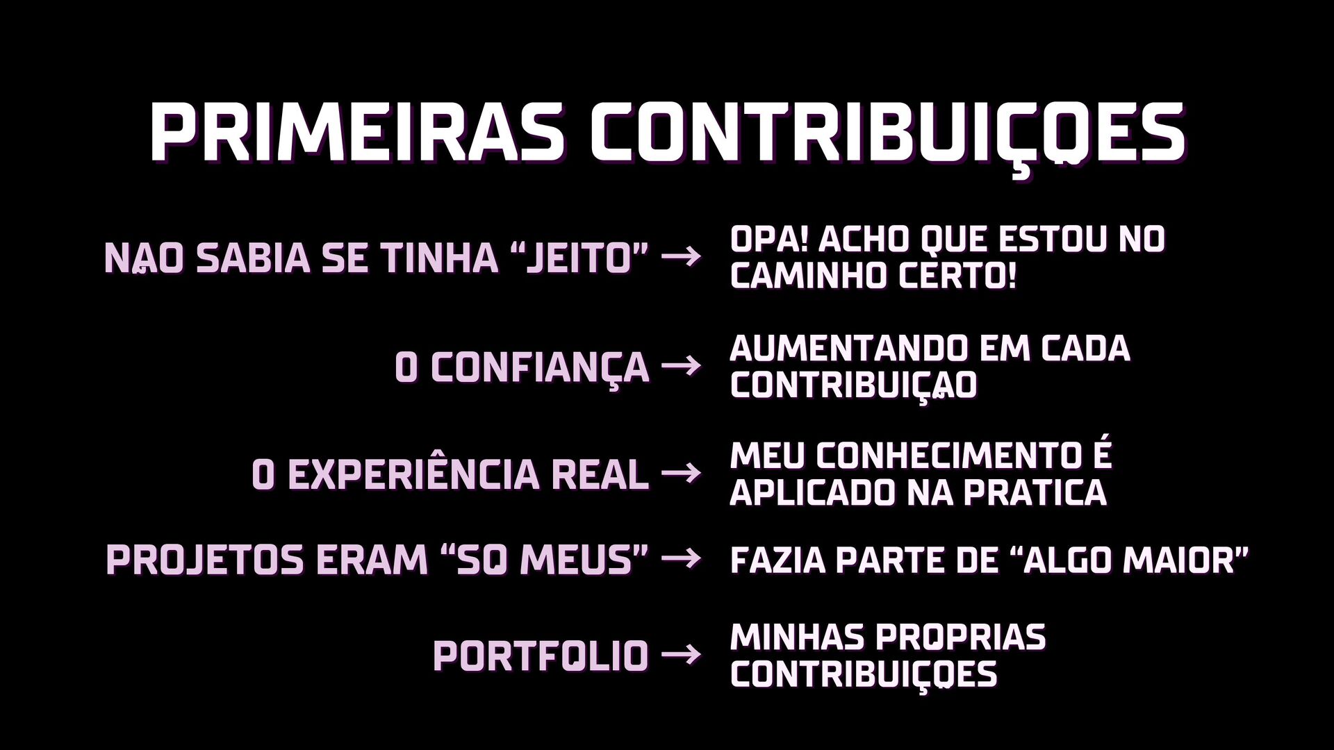 CERTO! OPA! ACHO QUE ESTOU NO CAMINHO CERTO! NÃO SABIA SE TINHA “JEITO” → NÃO SABIA SE TINHA “JEITO” → AUMENTANDO EM CADA CONTRIBUIÇÃO AUMENTANDO EM CADA CONTRIBUIÇÃO 0 CONFIANÇA → 0 CONFIANÇA → MEU CONHECIMENTO É APLICADO NA PRÁTICA MEU CONHECIMENTO É APLICADO NA PRÁTICA 0 EXPERIÊNCIA REAL → 0 EXPERIÊNCIA REAL → FAZIA PARTE DE “ALGO MAIOR” FAZIA PARTE DE “ALGO MAIOR” PROJETOS ERAM “SÓ MEUS” → PROJETOS ERAM “SÓ MEUS” → MINHAS PRÓPRIAS CONTRIBUIÇÕES MINHAS PRÓPRIAS CONTRIBUIÇÕES PORTFÓLIO → PORTFÓLIO →