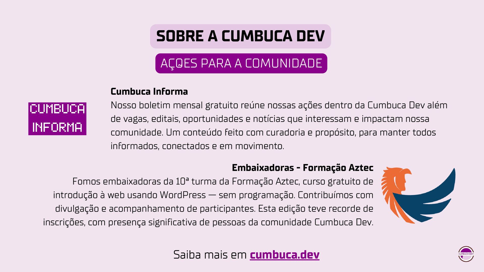 da Cumbuca Dev além de vagas, editais, oportunidades e notícias que interessam e impactam nossa comunidade. Um conteúdo feito com curadoria e propósito, para manter todos informados, conectados e em movimento. Embaixadoras - Formação Aztec Fomos embaixadoras da 10ª turma da Formação Aztec, curso gratuito de introdução à web usando WordPress — sem programação. Contribuímos com divulgação e acompanhamento de participantes. Esta edição teve recorde de inscrições, com presença significativa de pessoas da comunidade Cumbuca Dev. CUMBUCA INFORMA Saiba mais em cumbuca.dev AÇÕES PARA A COMUNIDADE SOBRE A CUMBUCA DEV