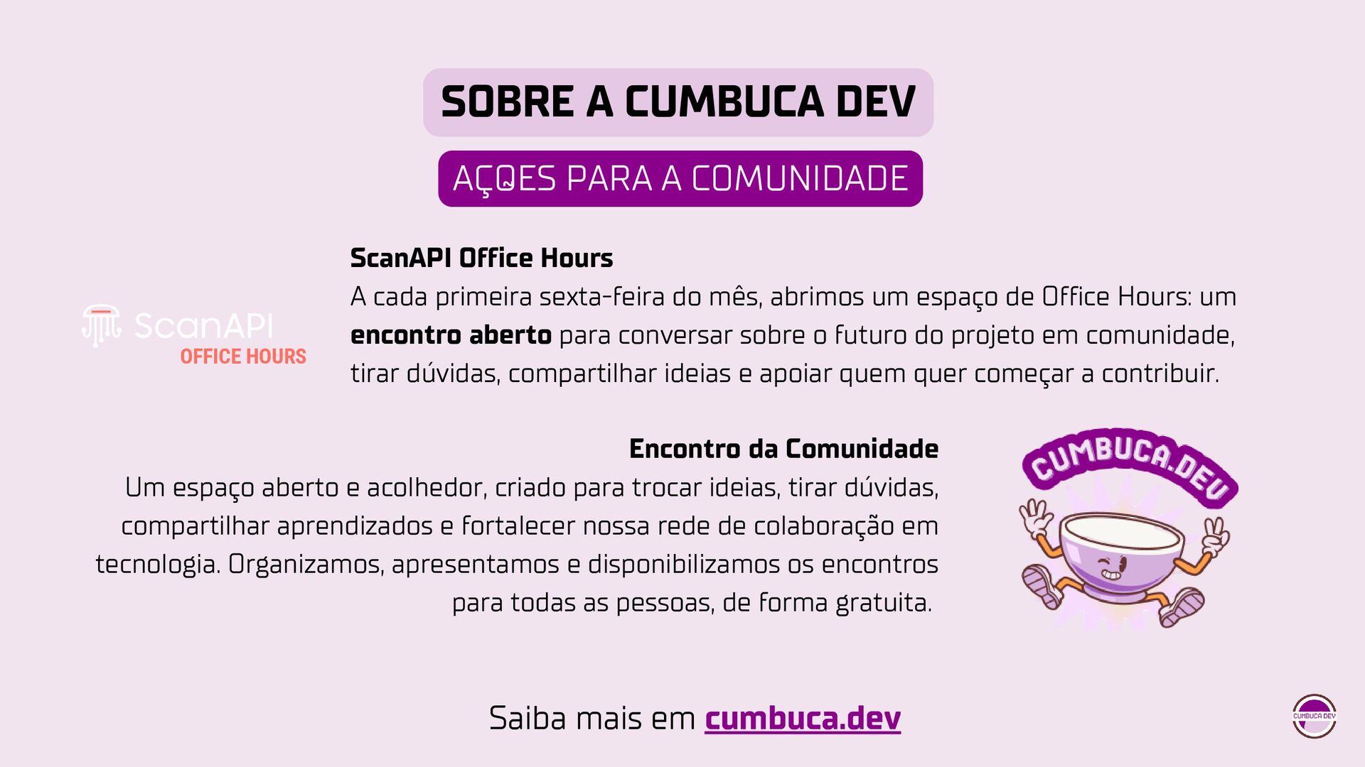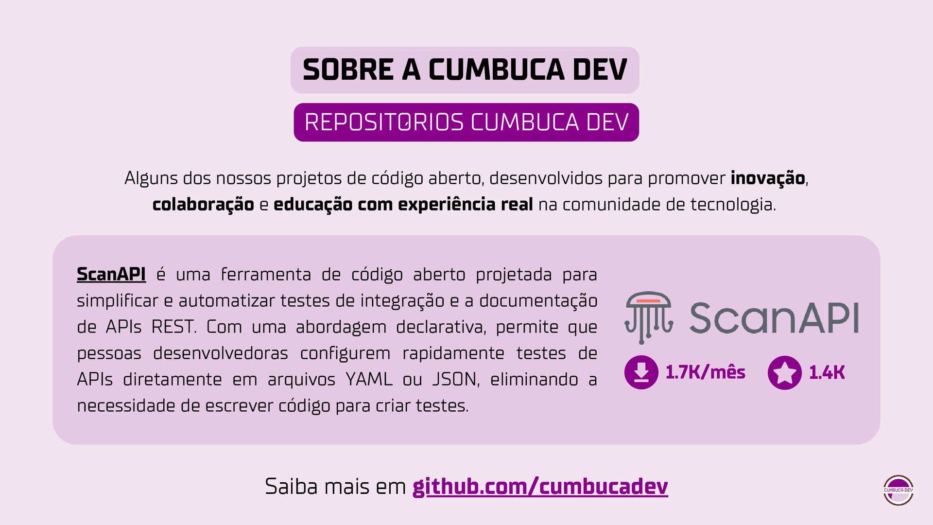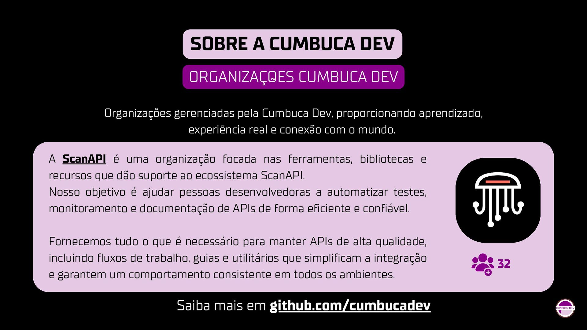 e recursos que dão suporte ao ecossistema ScanAPI. Nosso objetivo é ajudar pessoas desenvolvedoras a automatizar testes, monitoramento e documentação de APIs de forma eficiente e confiável. Fornecemos tudo o que é necessário para manter APIs de alta qualidade, incluindo fluxos de trabalho, guias e utilitários que simplificam a integração e garantem um comportamento consistente em todos os ambientes. Saiba mais em github.com/cumbucadev ORGANIZAÇÕES CUMBUCA DEV SOBRE A CUMBUCA DEV Organizações gerenciadas pela Cumbuca Dev, proporcionando aprendizado, experiência real e conexão com o mundo.