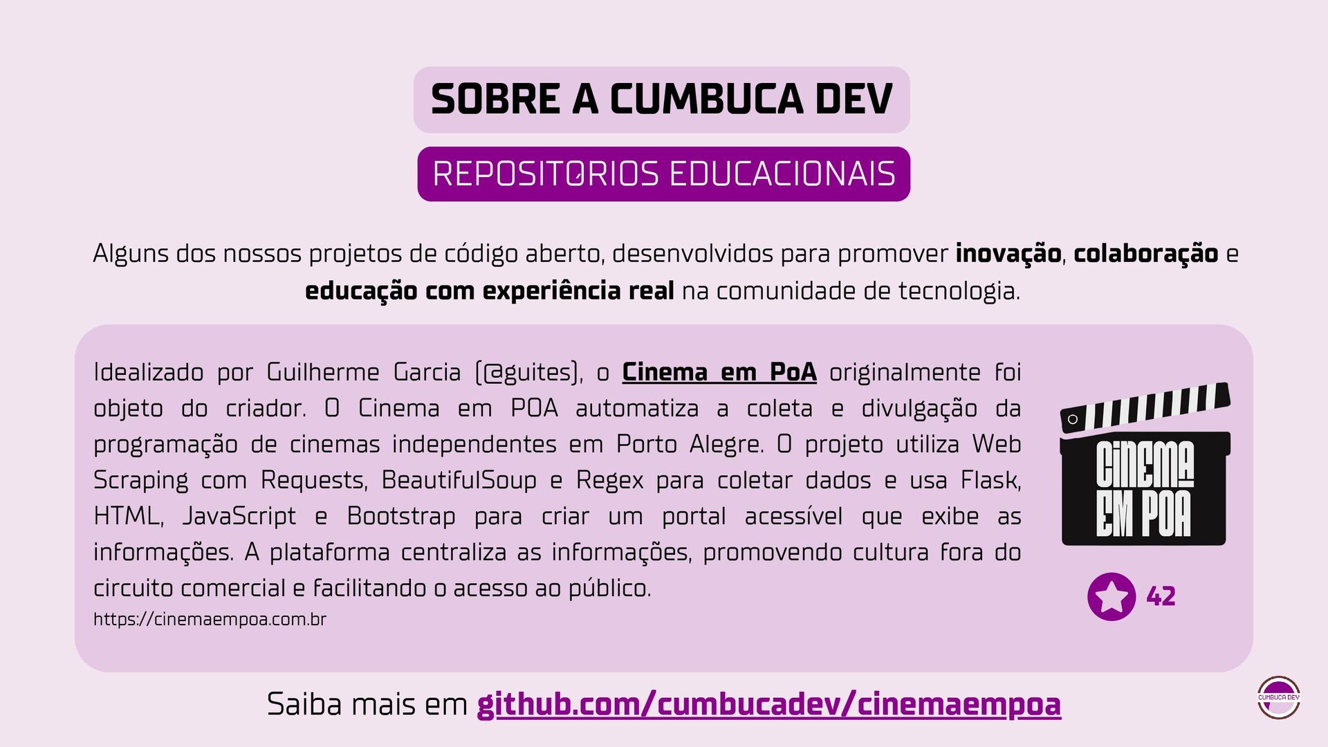 originalmente foi objeto do criador. O Cinema em POA automatiza a coleta e divulgação da programação de cinemas independentes em Porto Alegre. O projeto utiliza Web Scraping com Requests, BeautifulSoup e Regex para coletar dados e usa Flask, HTML, JavaScript e Bootstrap para criar um portal acessível que exibe as informações. A plataforma centraliza as informações, promovendo cultura fora do circuito comercial e facilitando o acesso ao público. https://cinemaempoa.com.br Saiba mais em github.com/cumbucadev/cinemaempoa Alguns dos nossos projetos de código aberto, desenvolvidos para promover inovação, colaboração e educação com experiência real na comunidade de tecnologia. REPOSITÓRIOS EDUCACIONAIS SOBRE A CUMBUCA DEV