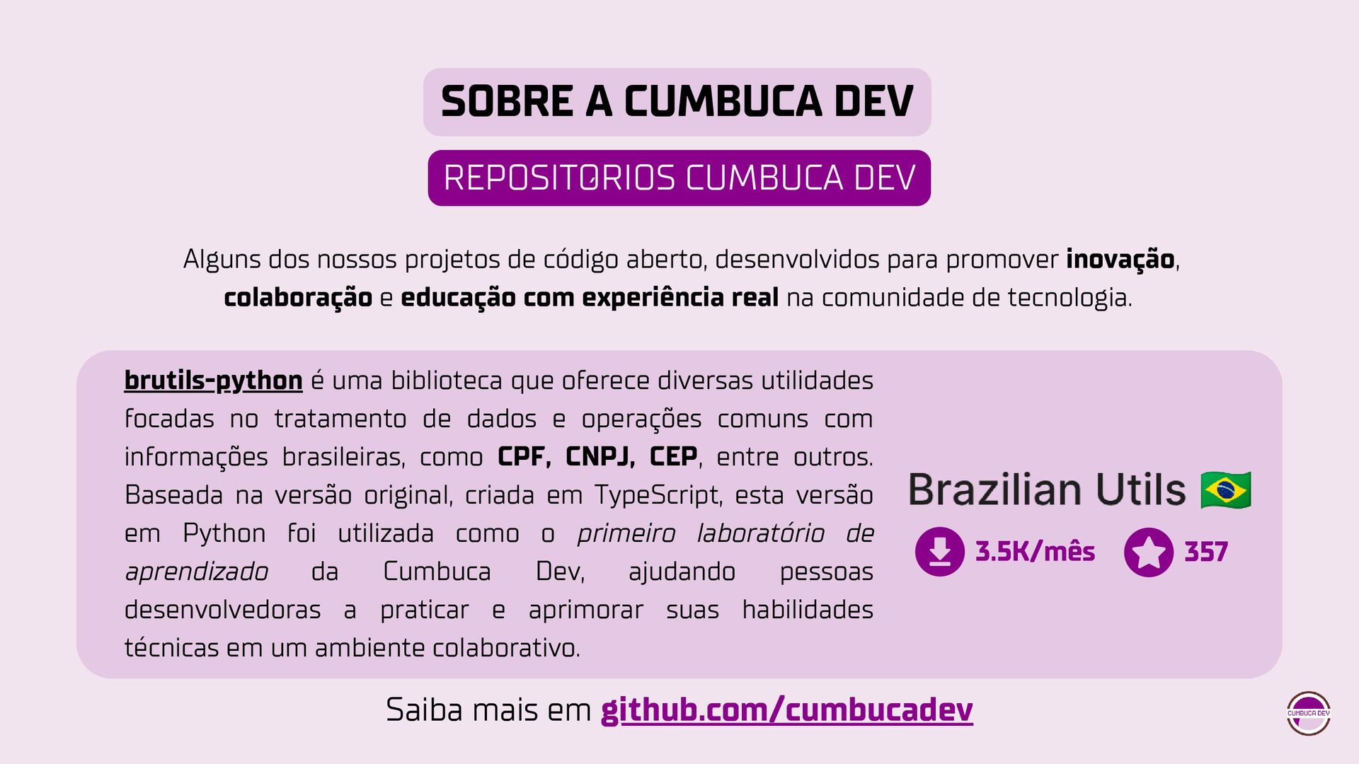 de utilitários projetadas para validar, gerar e manipular dados de acordo com as particularidades do Brasil 🇧🇷. Nosso objetivo é democratizar o acesso à informação e fornecer ferramentas que ajudem qualquer pessoa a criar, entender e trabalhar com sistemas brasileiros. Temos um repositório para cada linguagem de programação, seguindo padrões claros e consistentes, para que você possa usar nossos utilitários de forma fácil e confiável. Saiba mais em github.com/cumbucadev ORGANIZAÇÕES CUMBUCA DEV SOBRE A CUMBUCA DEV Organizações gerenciadas pela Cumbuca Dev, proporcionando aprendizado, experiência real e conexão com o mundo.