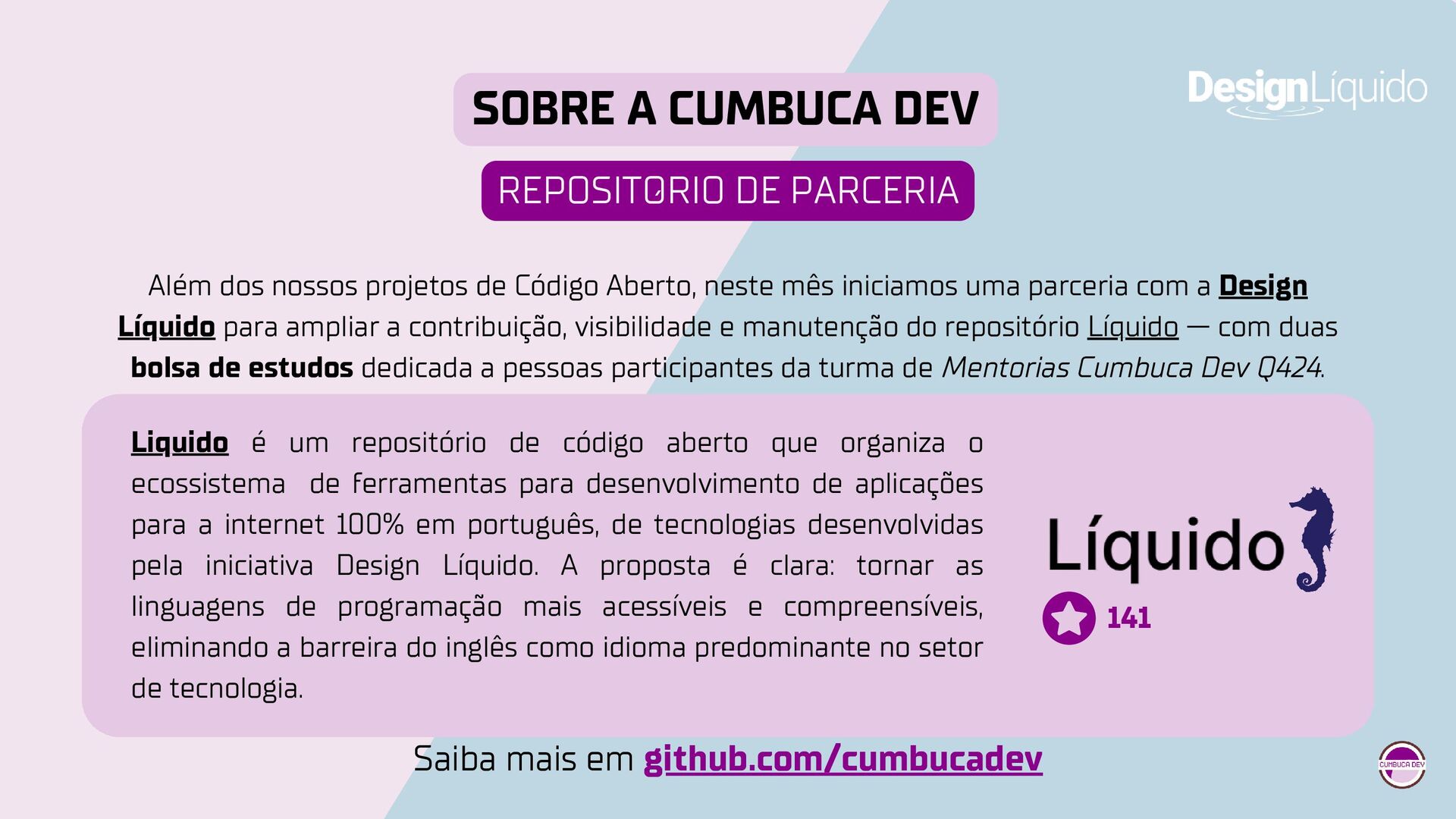 ecossistema de ferramentas para desenvolvimento de aplicações para a internet 100% em português, de tecnologias desenvolvidas pela iniciativa Design Líquido. A proposta é clara: tornar as linguagens de programação mais acessíveis e compreensíveis, eliminando a barreira do inglês como idioma predominante no setor de tecnologia. 141 Saiba mais em github.com/cumbucadev Além dos nossos projetos de Código Aberto, neste mês iniciamos uma parceria com a Design Líquido para ampliar a contribuição, visibilidade e manutenção do repositório Líquido — com duas bolsa de estudos dedicada a pessoas participantes da turma de Mentorias Cumbuca Dev Q424. REPOSITÓRIO DE PARCERIA SOBRE A CUMBUCA DEV