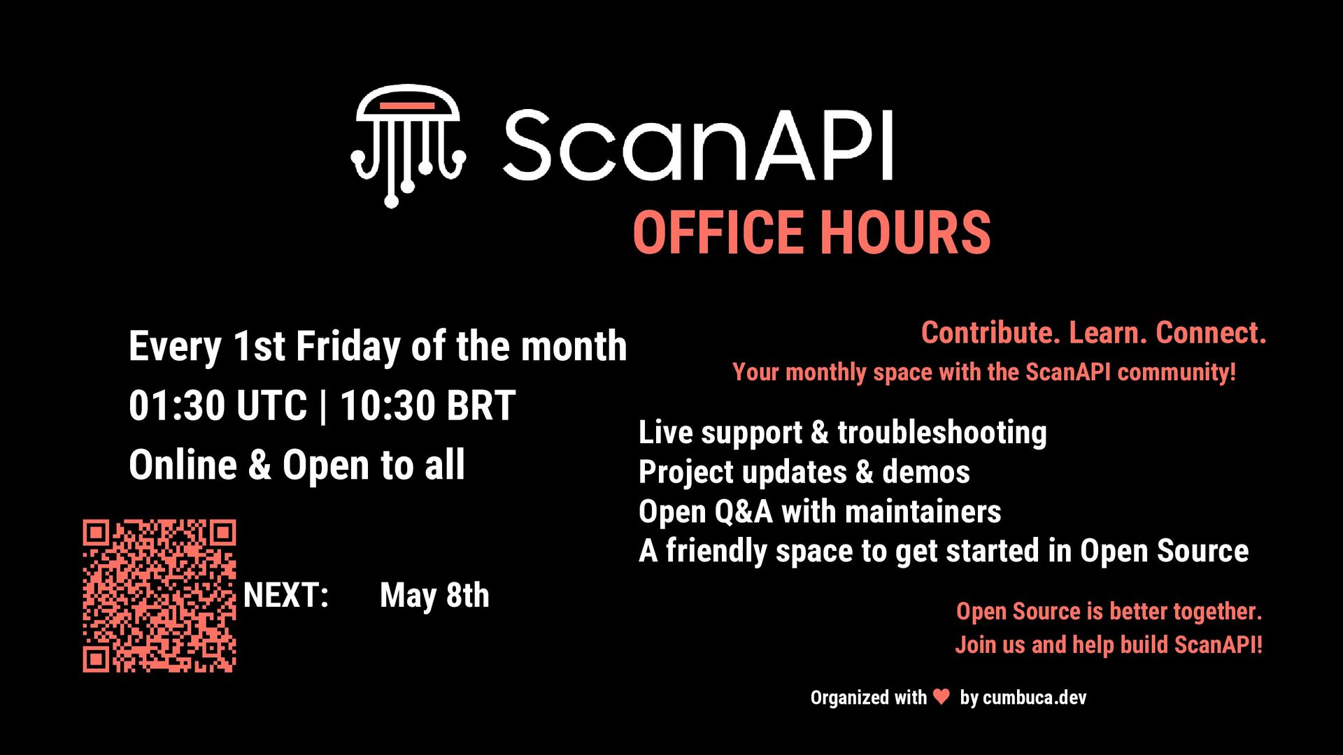 01:30 UTC | 10:30 BRT 📍 Online & Open to all Contribute. Learn. Connect. Your monthly space with the ScanAPI community! ✨ Live support & troubleshooting Project updates & demos Open Q&A with maintainers A friendly space to get started in Open Source 🌍 Open Source is better together. Join us and help build ScanAPI! Organized with ♥ by cumbuca.dev NEXT: 🗓 May 8th