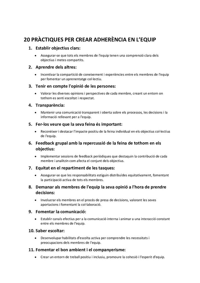 Estimular la confiança perquè els membres puguin expressar els seus dubtes i preocupacions sense por de represàlies. 13. Detectar els problemes amb aquelles persones de l'equip i parlar-ne: • Identificar i abordar els problemes interpersonal amb tacte, promocionant la resolució de conflictes constructiva. 14. Reunions de coordinació periòdiques: • Establir reunions regulars per revisar l'estat dels projectes, discutir les metes i coordinar esforços. 15. Oferir formació a la gent de l'equip: • Proporcionar oportunitats de desenvolupament professional per millorar les habilitats i coneixements dels membres de l'equip. 16. Reconeixement dels assoliments ben fets: • Celebrar els èxits individuals i col·lectius, reforçant un sentit de pertinença i motivació. 17. Posar referents o mentors per evitar angoixes als nouvinguts: • Assignar mentors o referents per als nous membres de l'equip per facilitar la seva integració i reduir la incertesa. 18. Deixar clares les expectatives de cadascú a la feina: • Establir expectatives clares pel que fa a responsabilitats i rols per evitar malentesos i millorar l'eficiència. 19. Promoure l'opinió de tothom a les reunions: • Encoratjar la participació activa de tots els membres a les reunions per garantir una representació equitativa de les idees i perspectives. 20. Jornada amb dues parts: • Organitzar jornades que combinin explicar la missió i funcions de l'equip amb sessions interactives per donar veu als membres sobre les fortaleses, febleses, oportunitats i amenaces.