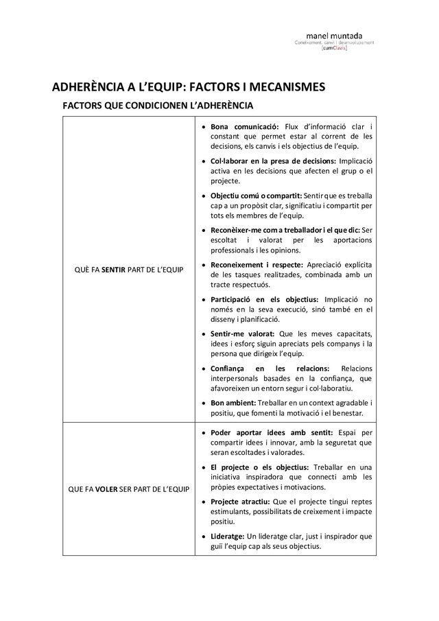 convivència i la satisfacció personal i col·lectiva. • Valors compartits: Una alineació de valors entre l’equip, l’organització i els propis, que generi identificació i compromís. • Aprenentatge: Un entorn on es valorin les oportunitats per créixer, experimentar i adquirir nous coneixements, tant de manera individual com col·lectiva. COM ESTIMULAR L’ADHERÈNCIA A L’EQUIP La part humana del lideratge: • Atenció a les persones: Demostrar interès genuí per les necessitats, inquietuds i opinions dels membres de l’equip. • Capacitat comunicativa: Escoltar activament i expressar-se de manera clara i empàtica per generar confiança i proximitat. Gestió de la presa de decisions: • Evitar personalismes: Adoptar un enfocament objectiu i equitatiu que reflecteixi les necessitats del col·lectiu, no interessos individuals. • Transparència: Explicar de manera oberta com es prenen les decisions, afavorint la comprensió i l’acceptació. Definició i comunicació d’objectius: • Objectius clars: Establir metes concretes i comprensibles que donin sentit a les accions de l’equip. • Explicació del propòsit: Comunicar de manera clara i concisa el “per què” de la feina, connectant-la amb els valors i la missió de l’organització. • Eficàcia en la comunicació: Assegurar que els objectius arribin a tots els membres de manera entenedora, eliminant ambigüitats. Generar il·lusió i compromís: • Inspirar amb projectes futurs: Presentar les perspectives de futur amb entusiasme, destacant el paper clau de l’equip en assolir-les. • Reconèixer assoliments passats: Valorar els èxits aconseguits per reforçar l’autoestima i la confiança de l’equip. Optimització del temps i espais de treball: • Gestió del temps com a recurs: Prioritzar reunions i activitats que realment aportin valor i estalviar temps als membres de l’equip.