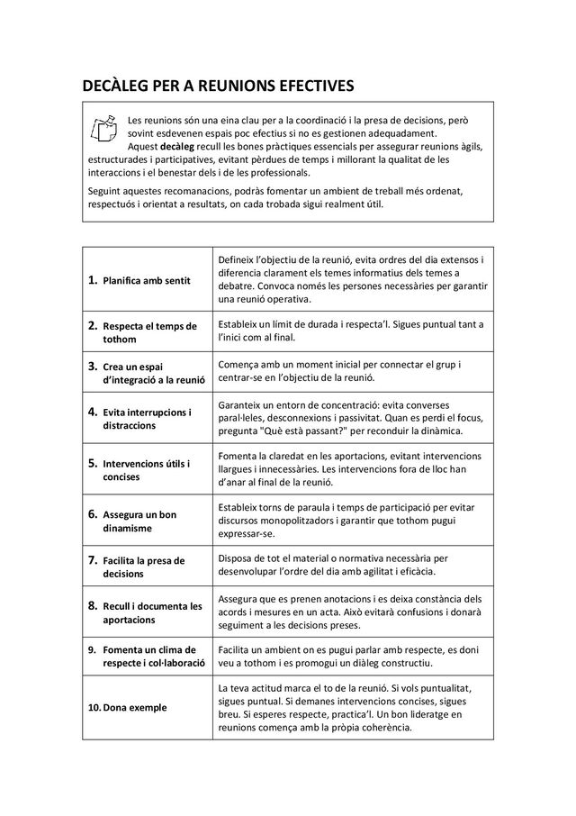 clau per a la coordinació i la presa de decisions, però sovint esdevenen espais poc efectius si no es gestionen adequadament. Aquest decàleg recull les bones pràctiques essencials per assegurar reunions àgils, estructurades i participatives, evitant pèrdues de temps i millorant la qualitat de les interaccions i el benestar dels i de les professionals. Seguint aquestes recomanacions, podràs fomentar un ambient de treball més ordenat, respectuós i orientat a resultats, on cada trobada sigui realment útil. 1. Planifica amb sentit Defineix l’objectiu de la reunió, evita ordres del dia extensos i diferencia clarament els temes informatius dels temes a debatre. Convoca només les persones necessàries per garantir una reunió operativa. 2. Respecta el temps de tothom Estableix un límit de durada i respecta’l. Sigues puntual tant a l’inici com al final. 3. Crea un espai d’integració a la reunió Comença amb un moment inicial per connectar el grup i centrar-se en l’objectiu de la reunió. 4. Evita interrupcions i distraccions Garanteix un entorn de concentració: evita converses paral·leles, desconnexions i passivitat. Quan es perdi el focus, pregunta "Què està passant?" per reconduir la dinàmica. 5. Intervencions útils i concises Fomenta la claredat en les aportacions, evitant intervencions llargues i innecessàries. Les intervencions fora de lloc han d’anar al final de la reunió. 6. Assegura un bon dinamisme Estableix torns de paraula i temps de participació per evitar discursos monopolitzadors i garantir que tothom pugui expressar-se. 7. Facilita la presa de decisions Disposa de tot el material o normativa necessària per desenvolupar l’ordre del dia amb agilitat i eficàcia. 8. Recull i documenta les aportacions Assegura que es prenen anotacions i es deixa constància dels acords i mesures en un acta. Això evitarà confusions i donarà seguiment a les decisions preses. 9. Fomenta un clima de respecte i col·laboració Facilita un ambient on es pugui parlar amb respecte, es doni veu a tothom i es promogui un diàleg constructiu. 10. Dona exemple La teva actitud marca el to de la reunió. Si vols puntualitat, sigues puntual. Si demanes intervencions concises, sigues breu. Si esperes respecte, practica’l. Un bon lideratge en reunions comença amb la pròpia coherència.
