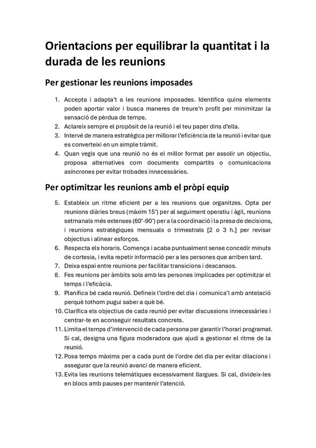 reunions Per gestionar les reunions imposades 1. Accepta i adapta’t a les reunions imposades. Identifica quins elements poden aportar valor i busca maneres de treure’n profit per minimitzar la sensació de pèrdua de temps. 2. Aclareix sempre el propòsit de la reunió i el teu paper dins d’ella. 3. Intervé de manera estratègica per millorar l’eficiència de la reunió i evitar que es converteixi en un simple tràmit. 4. Quan vegis que una reunió no és el millor format per assolir un objectiu, proposa alternatives com documents compartits o comunicacions asíncrones per evitar trobades innecessàries. Per optimitzar les reunions amb el pròpi equip 5. Estableix un ritme eficient per a les reunions que organitzes. Opta per reunions diàries breus (màxim 15’) per al seguiment operatiu i àgil, reunions setmanals més extenses (60’-90’) per a la coordinació i la presa de decisions, i reunions estratègiques mensuals o trimestrals [2 o 3 h.] per revisar objectius i alinear esforços. 6. Respecta els horaris. Comença i acaba puntualment sense concedir minuts de cortesia, i evita repetir informació per a les persones que arriben tard. 7. Deixa espai entre reunions per facilitar transicions i descansos. 8. Fes reunions per àmbits sols amb les persones implicades per optimitzar el temps i l’eficàcia. 9. Planifica bé cada reunió. Defineix l’ordre del dia i comunica’l amb antelació perquè tothom pugui saber a què bé. 10. Clarifica els objectius de cada reunió per evitar discussions innecessàries i centrar-te en aconseguir resultats concrets. 11. Limita el temps d’intervenció de cada persona per garantir l’horari programat. Si cal, designa una figura moderadora que ajudi a gestionar el ritme de la reunió. 12. Posa temps màxims per a cada punt de l'ordre del dia per evitar dilacions i assegurar que la reunió avanci de manera eficient. 13. Evita les reunions telemàtiques excessivament llargues. Si cal, divideix-les en blocs amb pauses per mantenir l’atenció.