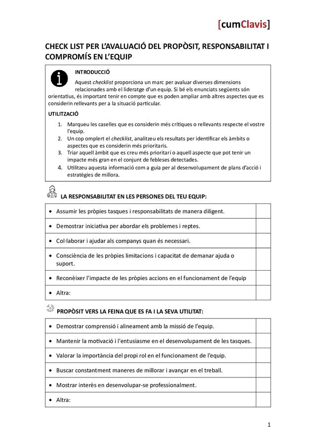 EN L’EQUIP INTRODUCCIÓ Aquest checklist proporciona un marc per avaluar diverses dimensions relacionades amb el lideratge d'un equip. Si bé els enunciats següents són orientatius, és important tenir en compte que es poden ampliar amb altres aspectes que es considerin rellevants per a la situació particular. UTILITZACIÓ 1. Marqueu les caselles que es considerin més crítiques o rellevants respecte el vostre l’equip. 2. Un cop omplert el checklist, analitzeu els resultats per identificar els àmbits o aspectes que es considerin més prioritaris. 3. Triar aquell àmbit que es creu més prioritari o aquell aspecte que pot tenir un impacte més gran en el conjunt de febleses detectades. 4. Utilitzeu aquesta informació com a guia per al desenvolupament de plans d’acció i estratègies de millora. LA RESPONSABILITAT EN LES PERSONES DEL TEU EQUIP: • Assumir les pròpies tasques i responsabilitats de manera diligent. • Demostrar iniciativa per abordar els problemes i reptes. • Col·laborar i ajudar als companys quan és necessari. • Consciència de les pròpies limitacions i capacitat de demanar ajuda o suport. • Reconèixer l’impacte de les pròpies accions en el funcionament de l’equip • Altra: PROPÒSIT VERS LA FEINA QUE ES FA I LA SEVA UTILITAT: • Demostrar comprensió i alineament amb la missió de l’equip. • Mantenir la motivació i l'entusiasme en el desenvolupament de les tasques. • Valorar la importància del propi rol en el funcionament de l’equip. • Buscar constantment maneres de millorar i avançar en el treball. • Mostrar interès en desenvolupar-se professionalment. • Altra: