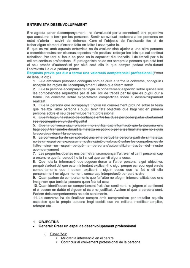 de millora Arribar a acords i compromisos de millora 2. CONSIDERACIONS PRÈVIES Periodicitat de l’entrevista: 1 cop a l’any. Avisar a la persona amb 15 dies d'antelació com a mínim i donar-li l’entrevista perquè se la pugui preparar. També l’haurem de preparar nosaltres. Important aquest temps de reflexió per ambdues parts. Recomanable un temps abans anotar fets concrets, coses del dia a dia, tenir fets concrets de la persona perquè s’hi reconegui. Dins de l’horari laboral Espai: o buscar un espai formal del centre que sigui càlid i còmode o taula rodona o bé taula que permeti asseure's de costat, buscar proximitat per parlar de manera relaxada Durada: de 60 a 90 minuts Model d’entrevista que sigui la mateixa per a tothom Valoració per competències fent una puntuació de cada competència del 1 al 5. Important tenir en compte com es comunica i quin propòsit té l’entrevista, plantejar-la com una oportunitat Importància de la implementació i que es plantegi com a general no com a qüestions pròpies de cada centre Abans d'iniciar l’entrevista preguntar: com estàs? Per oferir un primer moment de contacte, d’inici de conversa i perquè puguin sortir coses que es tenen en el cap que preocupen i poden desconcentrar l’atenció. Important que les persones que exerceixin el paper d’entrevistadores tinguin la preparació per a fer-ho, s’hagin format en aspectes de comunicació, puguin acordar amb altres persones els límits i els termes d’aquestes entrevistes, sobretot perquè durant les entrevistes les persones ens poden confiar aspectes personals, poden haver-hi moments de fragilitat emocional que s’han de saber contenir. 3. ESTRUCTURA a. Preparació prèvia La persona ha de tenir el guió de l’entrevista 15 dies abans del dia citat/da per fer-la La preparació prèvia ha de ser tant per part de l’entrevistat com per part de l’entrevistador b. Entrevista Durant l’entrevista hem de tenir alguns elements presents: • Primer sempre parla l’entrevistat: és el seu moment de reflexió i treball personal • El paper de l’entrevistador és secundari: la clau dominar les preguntes obertes per tal d’acompanyar l’altre més que donar molts missatges o opinions • Respectar els temps de silenci. • Ser objectius, no interpretar, dona dades concretes que ajudin a l’altre a entendre a que ens referim • Destaca els comportaments positius per reforçar-los • Cal que la persona entrevistada sigui qui lideri el seu propi canvi, qui proposi els aspectes que vol treballar Autoavaluació per part de la persona Avaluació per part de l’entrevistador posant de manifest aquells aspectes en els que s’està d’acord i també en els que s’està en desacord, veient d’aquests últims quins són els aspectes que es valoren com a diferents des d’un aspecte de millora. Cal reconduir per part de l’entrevistador els aspectes que es plantegen cap a millores i acords. c. Tancament i acords Fer un resum de tot el que hem parlat