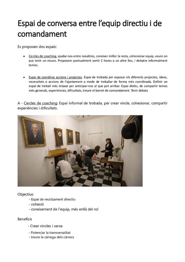proposen dos espais: • Cercles de coaching, ajudar-nos entre nosaltres, coneixer millor la resta, cohesionar equip, veure on puc tenir un recurs. Proposem puntualment sortir 2 hores a un altre lloc, i debatre informalment temes. • Espai de coordinar accions i projectes. Espai de trobada per exposar els diferents projectes, idees, necessitats o accions de l‘ajuntament a mode de treballar de forma més coordinada. Definir un espai de treball més relaxat per anticipar-nos al que pot arribar. Espai distès, de compartir temes més generals, experiències, dificultats, treure el barret de comandament. Tenir debats A - Cercles de coaching: Espai informal de trobada, per crear vincle, cohesionar, compartir experiències i dificultats. Objectius: - Espai de recolzament directiu - cohesió - coneixement de l‘equip, més enllà del rol Beneficis - Crear vincles i xarxa - Potenciar la transversalitat - treure la càrrega dels càrrecs