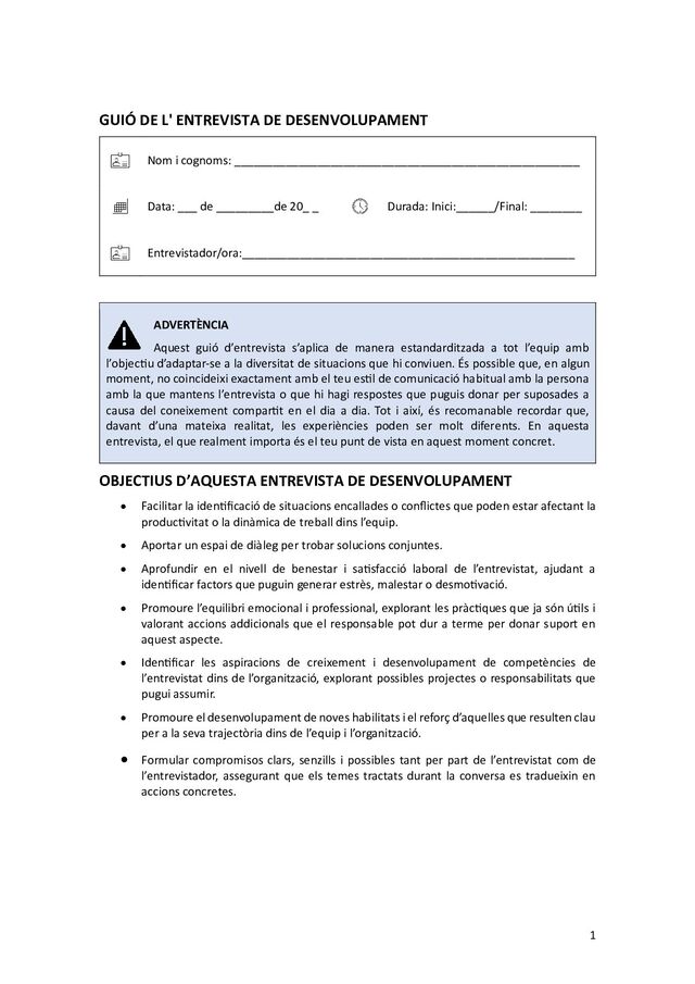 ______________________________________________________ Data: ___ de _________de 20_ _ Durada: Inici:______/Final: ________ Entrevistador/ora:____________________________________________________ ADVERTÈNCIA Aquest guió d’entrevista s’aplica de manera estandarditzada a tot l’equip amb l’objectiu d’adaptar-se a la diversitat de situacions que hi conviuen. És possible que, en algun moment, no coincideixi exactament amb el teu estil de comunicació habitual amb la persona amb la que mantens l’entrevista o que hi hagi respostes que puguis donar per suposades a causa del coneixement compartit en el dia a dia. Tot i així, és recomanable recordar que, davant d’una mateixa realitat, les experiències poden ser molt diferents. En aquesta entrevista, el que realment importa és el teu punt de vista en aquest moment concret. OBJECTIUS D’AQUESTA ENTREVISTA DE DESENVOLUPAMENT • Facilitar la identificació de situacions encallades o conflictes que poden estar afectant la productivitat o la dinàmica de treball dins l’equip. • Aportar un espai de diàleg per trobar solucions conjuntes. • Aprofundir en el nivell de benestar i satisfacció laboral de l’entrevistat, ajudant a identificar factors que puguin generar estrès, malestar o desmotivació. • Promoure l’equilibri emocional i professional, explorant les pràctiques que ja són útils i valorant accions addicionals que el responsable pot dur a terme per donar suport en aquest aspecte. • Identificar les aspiracions de creixement i desenvolupament de competències de l’entrevistat dins de l’organització, explorant possibles projectes o responsabilitats que pugui assumir. • Promoure el desenvolupament de noves habilitats i el reforç d’aquelles que resulten clau per a la seva trajectòria dins de l’equip i l’organització. • Formular compromisos clars, senzills i possibles tant per part de l’entrevistat com de l’entrevistador, assegurant que els temes tractats durant la conversa es tradueixin en accions concretes.