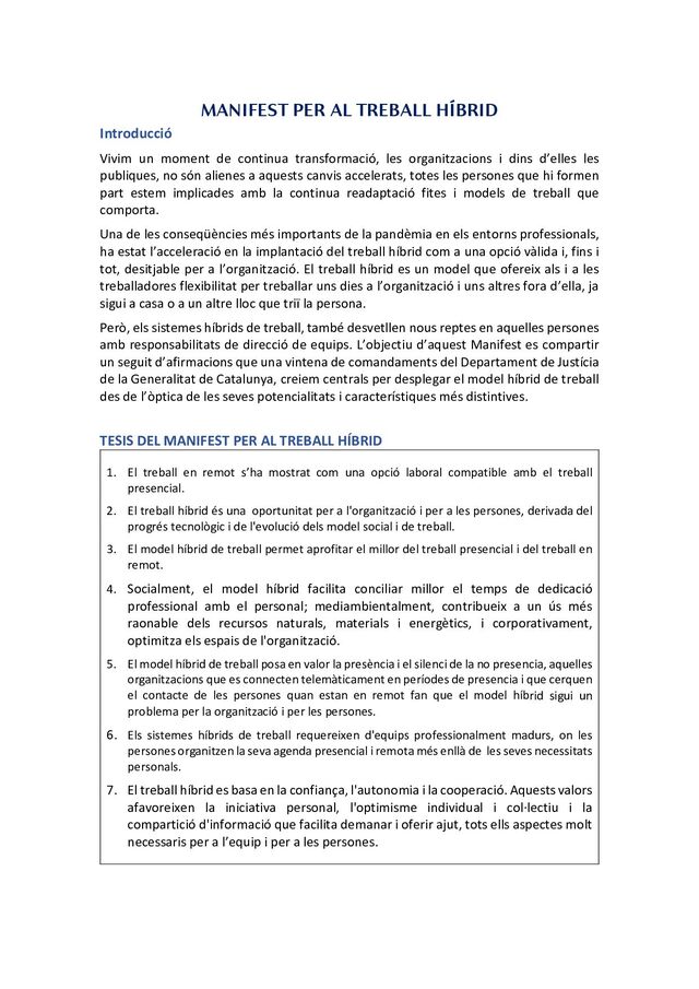 quedaven més velades en el model presencial, com la necessitat de compartir els objectius, d'organitzar el treball, generar mecanismes d'adherència entre les persones i gestionar el coneixement dels equips. 9. Per facilitar la dinàmica de l’equip és fonamental que cada membre de l'equip conegui els objectius, què hi aporten els altres i què s'espera de cadascú 10. Per a una integració i utilització corresponsable del model híbrid de treball, cal que tothom de l’equip participi en la regulació del temps i l’ús que cal fer-ne. 11. Transitar amb èxit cap a un model híbrid de treball suposa haver de gestionar el canvi i desactivar les resistències inherents a qualsevol transformació. 12. Un catalitzador essencial del canvi és que les direccions i els/les comandaments siguin l'exemple del canvi que es vol impulsar. 13. Alimentar falses creences, com ara que el treball híbrid és un fenomen temporal, que disminueix la productivitat, que malmet la cultura corporativa o que dificulta el treball en equip, és una forma de resistir-se al canvi i, com a tal, no aporta valor ni ajuda al canvi. 14. El model híbrid de treball és una magnífica oportunitat per canviar els mecanismes clàssics de control laboral sobre les persones i, al seu lloc, desenvolupar relacions professionals basades en la responsabilitat i el treball en equip. 15. En el model híbrid, el focus del control no és la persona sinó els seus resultats i la contribució a l’assoliment dels objectius i a la salut de la dinàmica l’equip. 16. En el model híbrid de treball la persona ha de disposar d'un temps reservat, sense interrupcions, per dur a terme tasques que exigeixin atenció, concentració i silenci. 17. Per optimitzar la combinació de presencialitat i treball en remot cal treure el màxim partit de les eines i els canals de comunicació, conèixer-les, fer-ne un bon ús i, si cal, regular-lo. 18. Els canals de comunicació propis dels sistemes híbrids de treball, visibilitzen les persones i faciliten les relacions horitzontals en el conjunt de l'organització. 19. El model híbrid de treball posa de relleu la importància de gestionar el coneixement de l'equip.