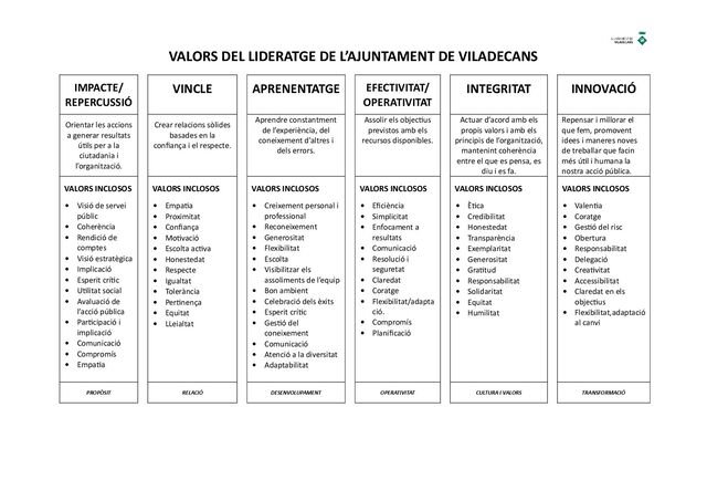 APRENENTATGE EFECTIVITAT/ OPERATIVITAT INTEGRITAT INNOVACIÓ Orientar les accions a generar resultats útils per a la ciutadania i l’organització. Crear relacions sòlides basades en la confiança i el respecte. Aprendre constantment de l’experiència, del coneixement d’altres i dels errors. Assolir els objectius previstos amb els recursos disponibles. Actuar d’acord amb els propis valors i amb els principis de l’organització, mantenint coherència entre el que es pensa, es diu i es fa. Repensar i millorar el que fem, promovent idees i maneres noves de treballar que facin més útil i humana la nostra acció pública. VALORS INCLOSOS VALORS INCLOSOS VALORS INCLOSOS VALORS INCLOSOS VALORS INCLOSOS VALORS INCLOSOS • Visió de servei públic • Coherència • Rendició de comptes • Visió estratègica • Implicació • Esperit crític • Utilitat social • Avaluació de l’acció pública • Participació i implicació • Comunicació • Compromís • Empatia • Empatia • Proximitat • Confiança • Motivació • Escolta activa • Honestedat • Respecte • Igualtat • Tolerància • Pertinença • Equitat • LLeialtat • Creixement personal i professional • Reconeixement • Generositat • Flexibilitat • Escolta • Visibilitzar els assoliments de l’equip • Bon ambient • Celebració dels èxits • Esperit crític • Gestió del coneixement • Comunicació • Atenció a la diversitat • Adaptabilitat • Eficiència • Simplicitat • Enfocament a resultats • Comunicació • Resolució i seguretat • Claredat • Coratge • Flexibilitat/adapta ció. • Compromís • Planificació • Ètica • Credibilitat • Honestedat • Transparència • Exemplaritat • Generositat • Gratitud • Responsabilitat • Solidaritat • Equitat • Humilitat • Valentia • Coratge • Gestió del risc • Obertura • Responsabilitat • Delegació • Creativitat • Accessibilitat • Claredat en els objectius • Flexibilitat,adaptació al canvi PROPÒSIT RELACIÓ DESENVOLUPAMENT OPERATIVITAT CULTURA I VALORS TRANSFORMACIÓ