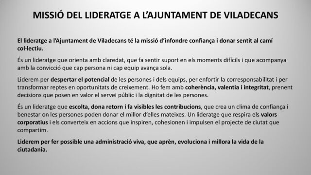l’Ajuntament de Viladecans té la missió d’infondre confiança i donar sentit al camí col·lectiu. És un lideratge que orienta amb claredat, que fa sentir suport en els moments difícils i que acompanya amb la convicció que cap persona ni cap equip avança sola. Liderem per despertar el potencial de les persones i dels equips, per enfortir la corresponsabilitat i per transformar reptes en oportunitats de creixement. Ho fem amb coherència, valentia i integritat, prenent decisions que posen en valor el servei públic i la dignitat de les persones. És un lideratge que escolta, dona retorn i fa visibles les contribucions, que crea un clima de confiança i benestar on les persones poden donar el millor d’elles mateixes. Un lideratge que respira els valors corporatius i els converteix en accions que inspiren, cohesionen i impulsen el projecte de ciutat que compartim. Liderem per fer possible una administració viva, que aprèn, evoluciona i millora la vida de la ciutadania.