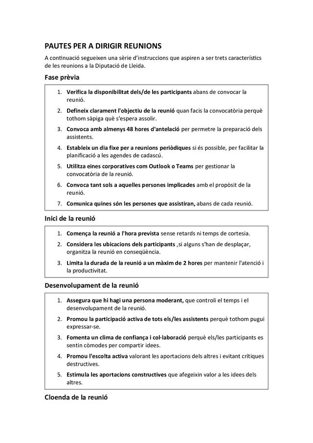 d’instruccions que aspiren a ser trets característics de les reunions a la Diputació de Lleida. Fase prèvia 1. Verifica la disponibilitat dels/de les participants abans de convocar la reunió. 2. Defineix clarament l'objectiu de la reunió quan facis la convocatòria perquè tothom sàpiga què s'espera assolir. 3. Convoca amb almenys 48 hores d'antelació per permetre la preparació dels assistents. 4. Estableix un dia fixe per a reunions periòdiques si és possible, per facilitar la planificació a les agendes de cadascú. 5. Utilitza eines corporatives com Outlook o Teams per gestionar la convocatòria de la reunió. 6. Convoca tant sols a aquelles persones implicades amb el propòsit de la reunió. 7. Comunica quines són les persones que assistiran, abans de cada reunió. Inici de la reunió 1. Comença la reunió a l'hora prevista sense retards ni temps de cortesia. 2. Considera les ubicacions dels participants ,si alguns s'han de desplaçar, organitza la reunió en conseqüència. 3. Limita la durada de la reunió a un màxim de 2 hores per mantenir l'atenció i la productivitat. Desenvolupament de la reunió 1. Assegura que hi hagi una persona moderant, que controli el temps i el desenvolupament de la reunió. 2. Promou la participació activa de tots els/les assistents perquè tothom pugui expressar-se. 3. Fomenta un clima de confiança i col·laboració perquè els/les participants es sentin còmodes per compartir idees. 4. Promou l'escolta activa valorant les aportacions dels altres i evitant crítiques destructives. 5. Estimula les aportacions constructives que afegeixin valor a les idees dels altres. Cloenda de la reunió