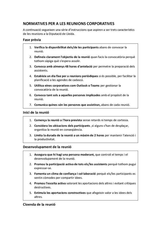 sèrie d’instruccions que aspiren a ser trets característics de les reunions a la Diputació de Lleida. Fase prèvia 1. Verifica la disponibilitat dels/de les participants abans de convocar la reunió. 2. Defineix clarament l'objectiu de la reunió quan facis la convocatòria perquè tothom sàpiga què s'espera assolir. 3. Convoca amb almenys 48 hores d'antelació per permetre la preparació dels assistents. 4. Estableix un dia fixe per a reunions periòdiques si és possible, per facilitar la planificació a les agendes de cadascú. 5. Utilitza eines corporatives com Outlook o Teams per gestionar la convocatòria de la reunió. 6. Convoca tant sols a aquelles persones implicades amb el propòsit de la reunió. 7. Comunica quines són les persones que assistiran, abans de cada reunió. Inici de la reunió 1. Comença la reunió a l'hora prevista sense retards ni temps de cortesia. 2. Considera les ubicacions dels participants ,si alguns s'han de desplaçar, organitza la reunió en conseqüència. 3. Limita la durada de la reunió a un màxim de 2 hores per mantenir l'atenció i la productivitat. Desenvolupament de la reunió 1. Assegura que hi hagi una persona moderant, que controli el temps i el desenvolupament de la reunió. 2. Promou la participació activa de tots els/les assistents perquè tothom pugui expressar-se. 3. Fomenta un clima de confiança i col·laboració perquè els/les participants es sentin còmodes per compartir idees. 4. Promou l'escolta activa valorant les aportacions dels altres i evitant crítiques destructives. 5. Estimula les aportacions constructives que afegeixin valor a les idees dels altres. Cloenda de la reunió