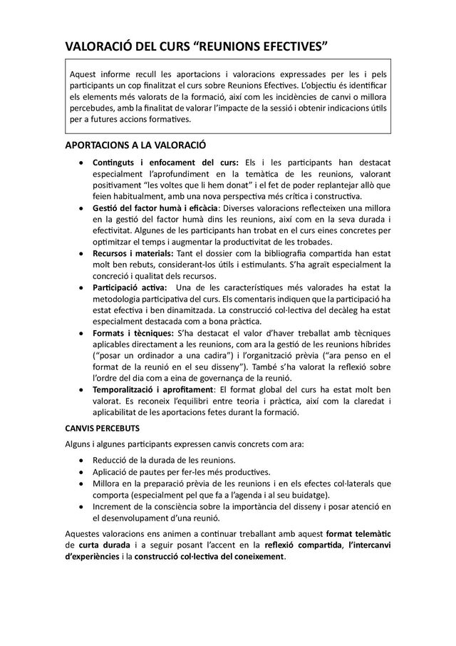 i valoracions expressades per les i pels participants un cop finalitzat el curs sobre Reunions Efectives. L’objectiu és identificar els elements més valorats de la formació, així com les incidències de canvi o millora percebudes, amb la finalitat de valorar l’impacte de la sessió i obtenir indicacions útils per a futures accions formatives. APORTACIONS A LA VALORACIÓ • Continguts i enfocament del curs: Els i les participants han destacat especialment l’aprofundiment en la temàtica de les reunions, valorant positivament “les voltes que li hem donat” i el fet de poder replantejar allò que feien habitualment, amb una nova perspectiva més crítica i constructiva. • Gestió del factor humà i eficàcia: Diverses valoracions reflecteixen una millora en la gestió del factor humà dins les reunions, així com en la seva durada i efectivitat. Algunes de les participants han trobat en el curs eines concretes per optimitzar el temps i augmentar la productivitat de les trobades. • Recursos i materials: Tant el dossier com la bibliografia compartida han estat molt ben rebuts, considerant-los útils i estimulants. S’ha agraït especialment la concreció i qualitat dels recursos. • Participació activa: Una de les característiques més valorades ha estat la metodologia participativa del curs. Els comentaris indiquen que la participació ha estat efectiva i ben dinamitzada. La construcció col·lectiva del decàleg ha estat especialment destacada com a bona pràctica. • Formats i tècniques: S’ha destacat el valor d’haver treballat amb tècniques aplicables directament a les reunions, com ara la gestió de les reunions híbrides (“posar un ordinador a una cadira”) i l’organització prèvia (“ara penso en el format de la reunió en el seu disseny”). També s’ha valorat la reflexió sobre l’ordre del dia com a eina de governança de la reunió. • Temporalització i aprofitament: El format global del curs ha estat molt ben valorat. Es reconeix l’equilibri entre teoria i pràctica, així com la claredat i aplicabilitat de les aportacions fetes durant la formació. CANVIS PERCEBUTS Alguns i algunes participants expressen canvis concrets com ara: • Reducció de la durada de les reunions. • Aplicació de pautes per fer-les més productives. • Millora en la preparació prèvia de les reunions i en els efectes col·laterals que comporta (especialment pel que fa a l’agenda i al seu buidatge). • Increment de la consciència sobre la importància del disseny i posar atenció en el desenvolupament d’una reunió. Aquestes valoracions ens animen a continuar treballant amb aquest format telemàtic de curta durada i a seguir posant l’accent en la reflexió compartida, l’intercanvi d’experiències i la construcció col·lectiva del coneixement.