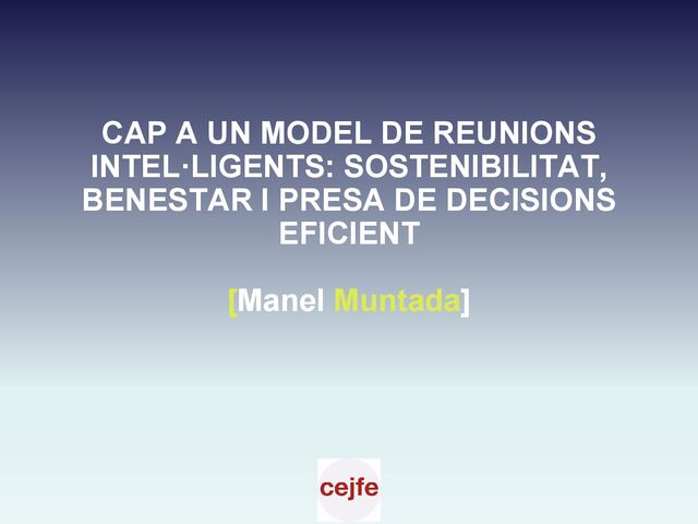 realitat professional, identificant les principals problemàtiques associades a la seva gestió actual. Unificar punts de vista en torn als criteris de sostenibilitat, benestar professional i efectivitat en la presa de decisions, que han d’orientar les nostres reunions. Elaborar una proposta metodológica per reorientar el nostre sistema de reunions
