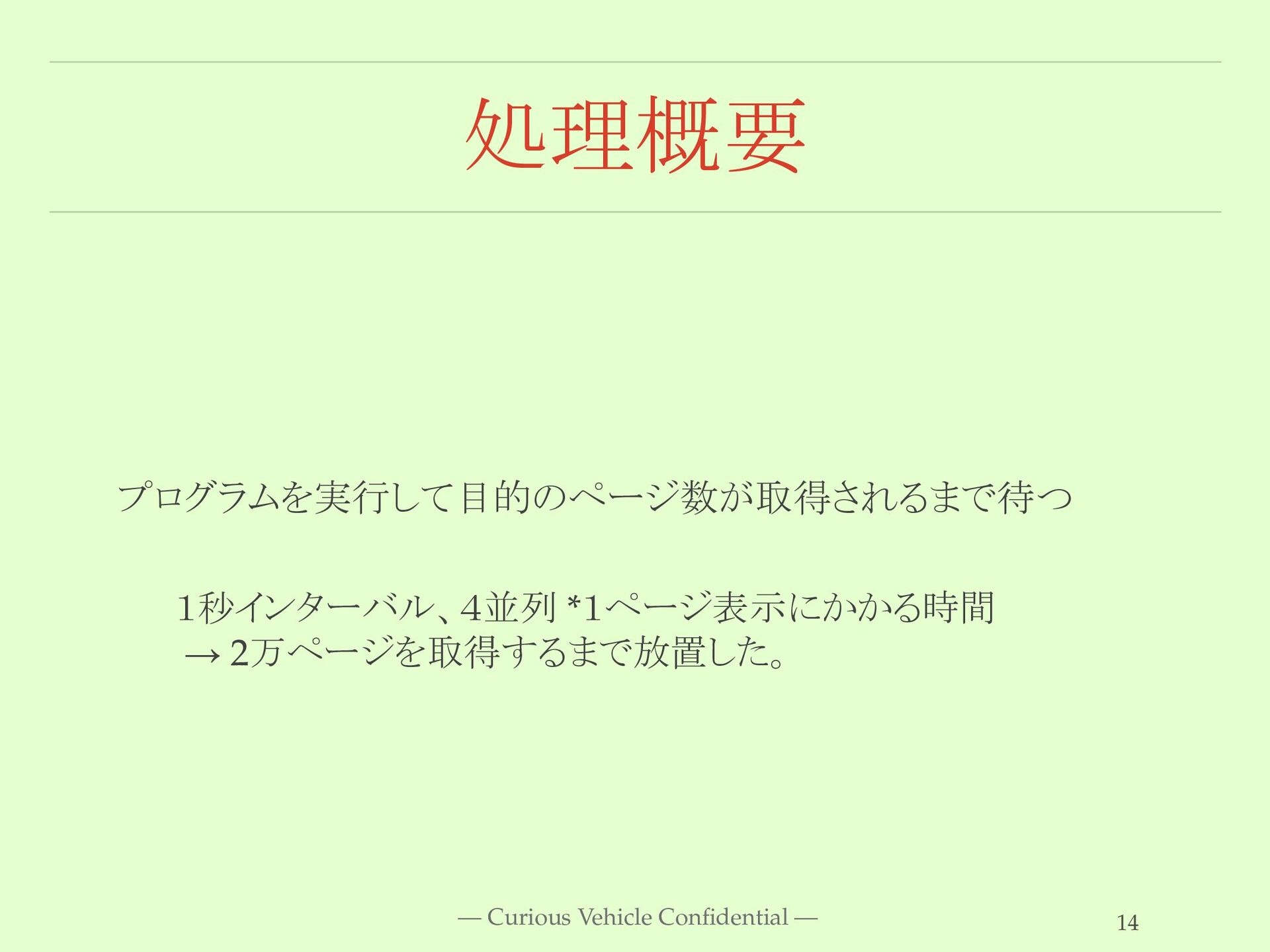 処理概要 — Curious Vehicle Confidential — 14 プログラムを実行して目的のページ数が取得されるまで待つ 1秒インターバル、4並列 *1ページ表示にかかる時間