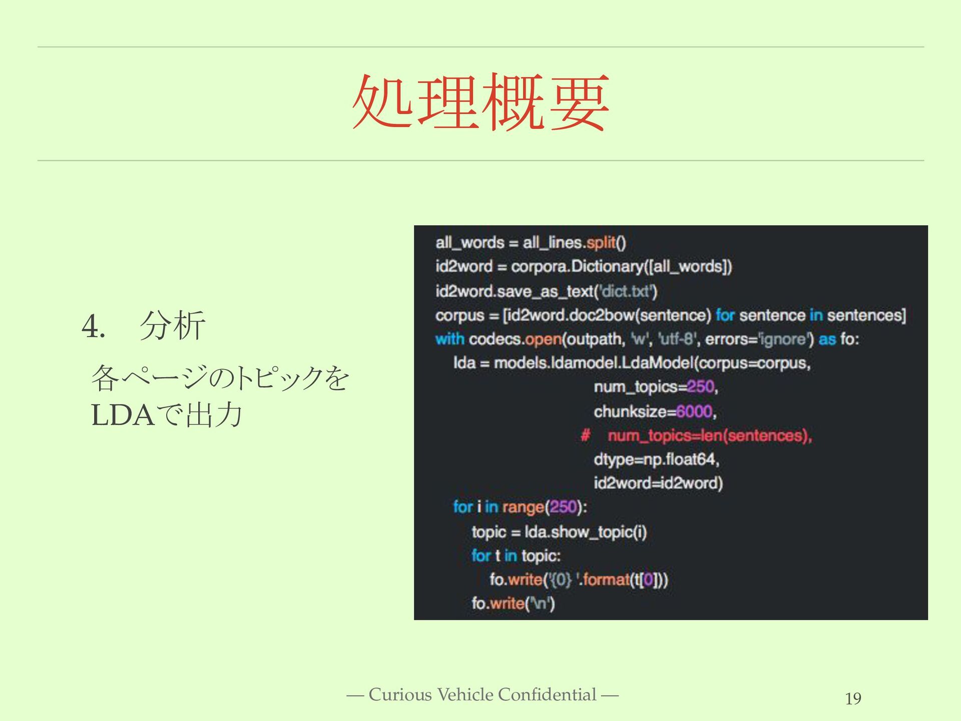 処理概要 4. 分析 — Curious Vehicle Confidential — 19 各ページのトピックを