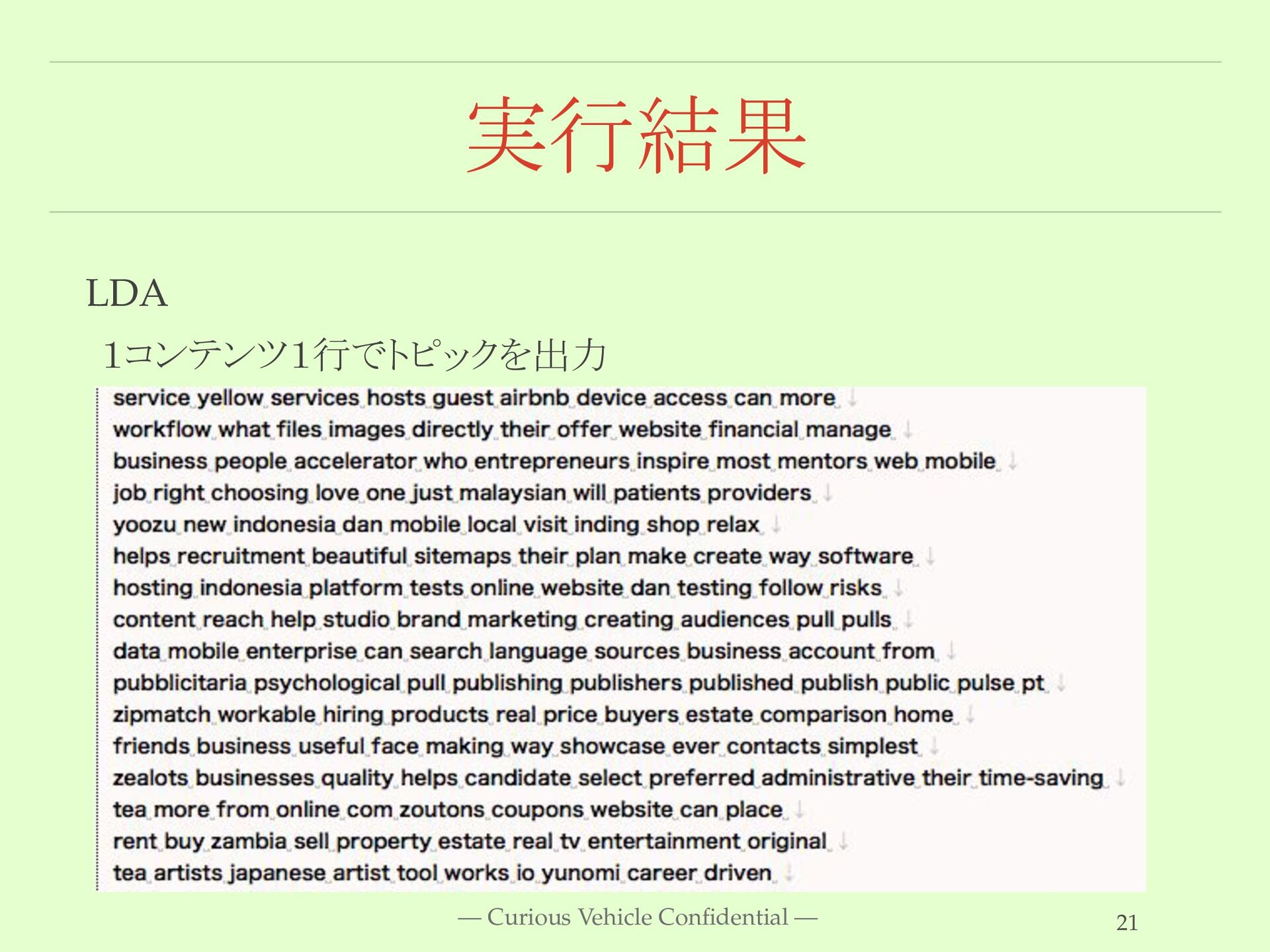 実行結果 — Curious Vehicle Confidential — 21 LDA 1コンテンツ1行でトピックを出力