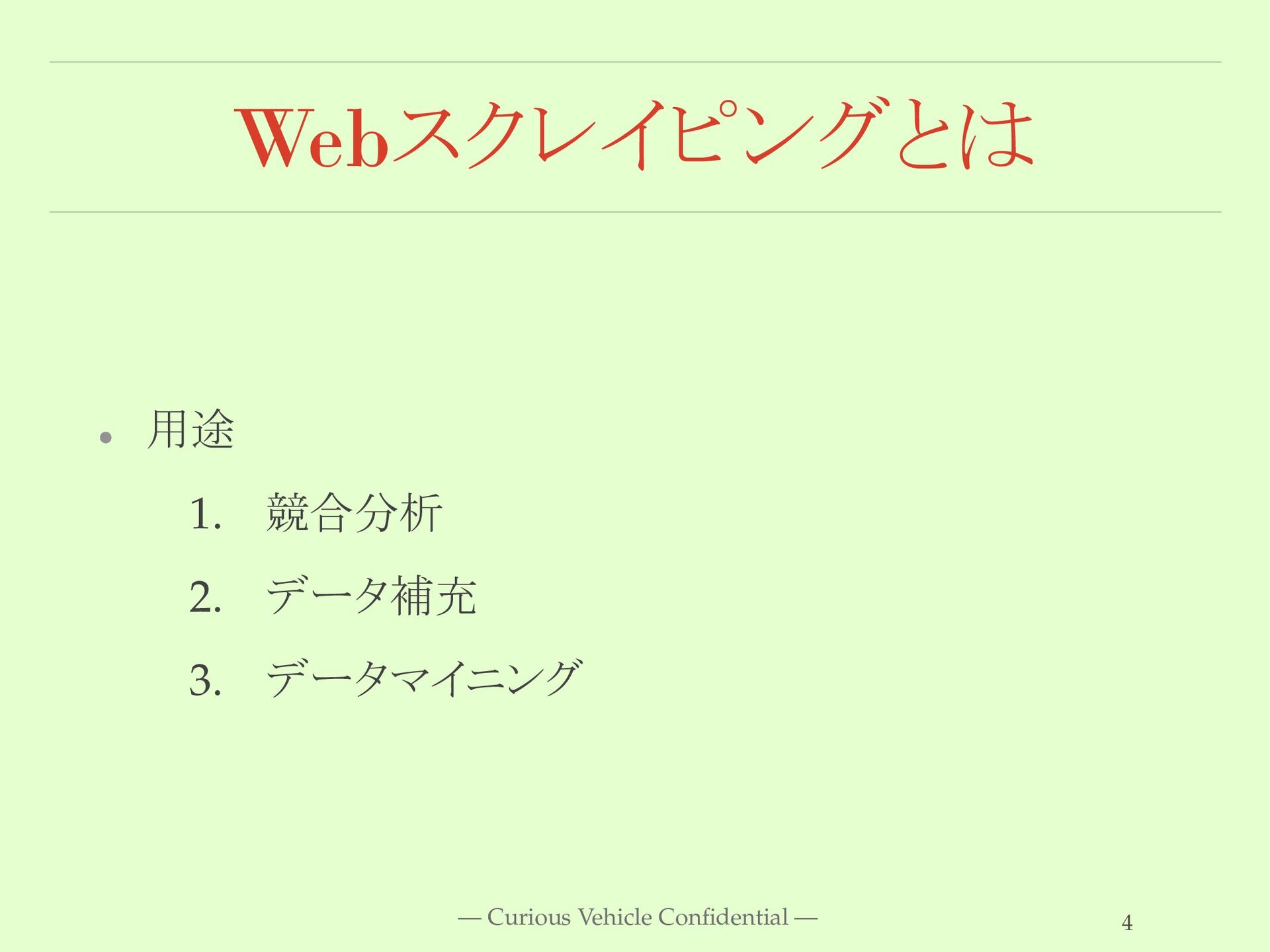 Webスクレイピングとは • 用途 1. 競合分析 2. データ補充 3. データマイニング —