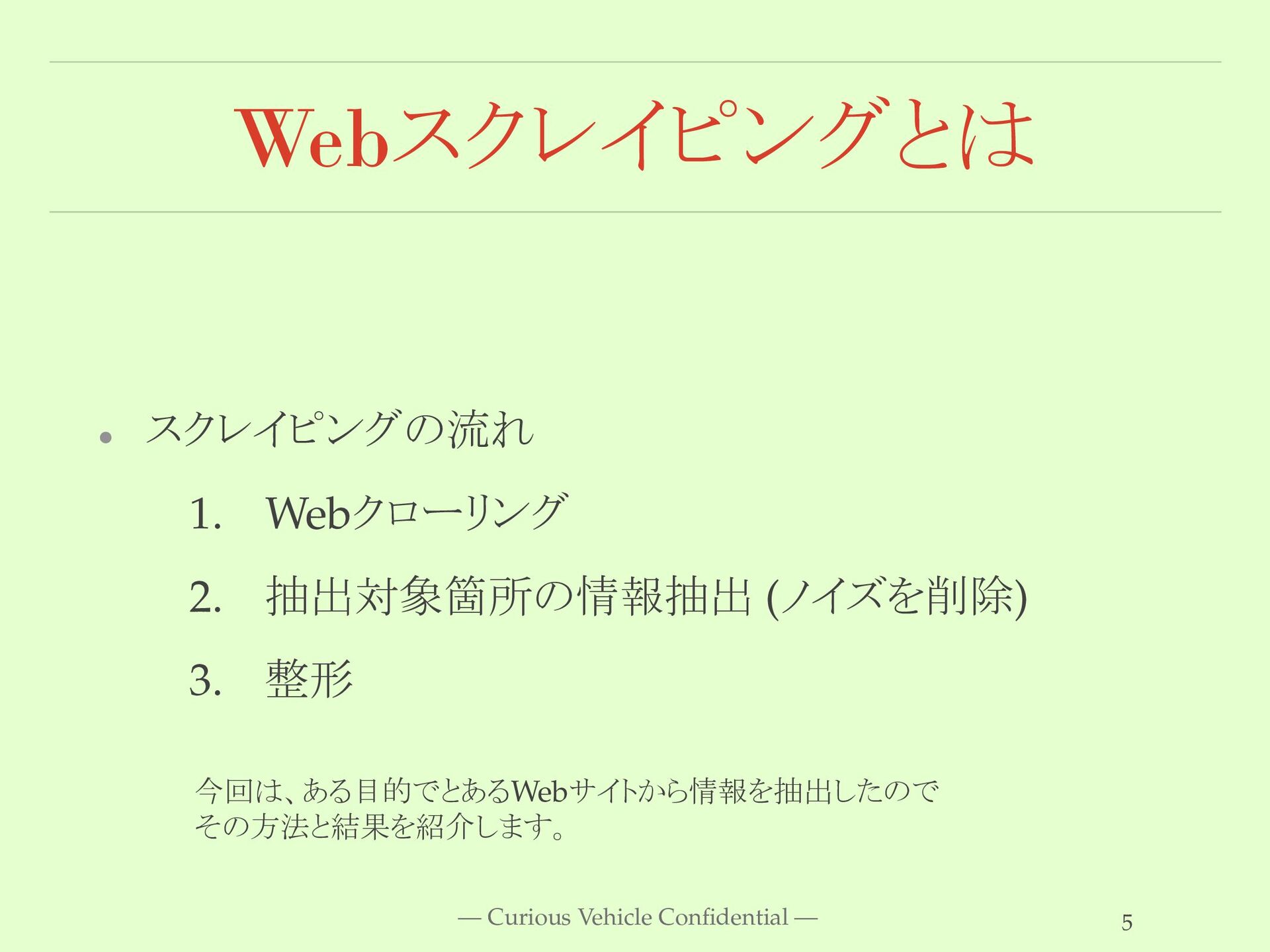 — Curious Vehicle Confidential — 5 今回は、ある目的でとあるWebサイトから情報を抽出したので その方法と結果を紹介します。