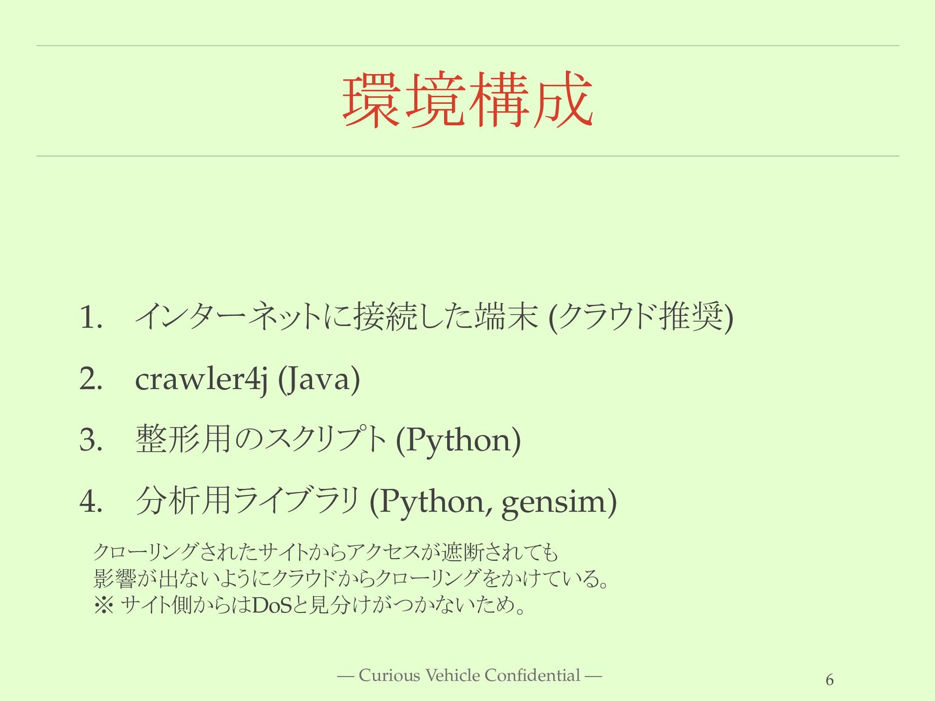 4. 分析用ライブラリ (Python, gensim) — Curious Vehicle Confidential — 6 クローリングされたサイトからアクセスが遮断されても 影響が出ないようにクラウドからクローリングをかけている。 ※ サイト側からはDoSと見分けがつかないため。