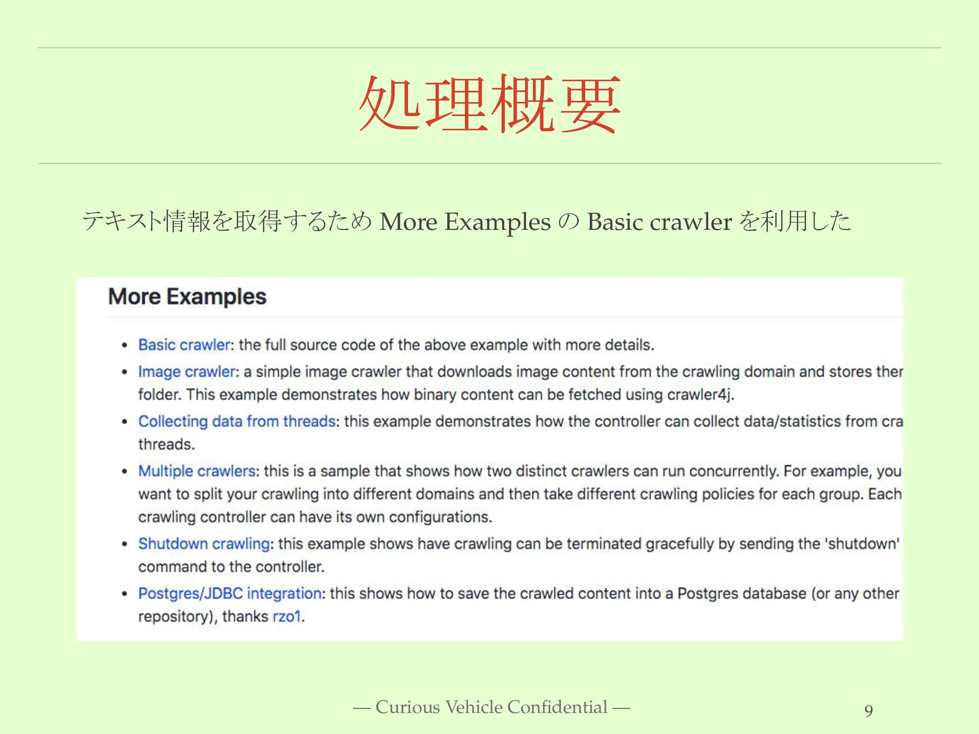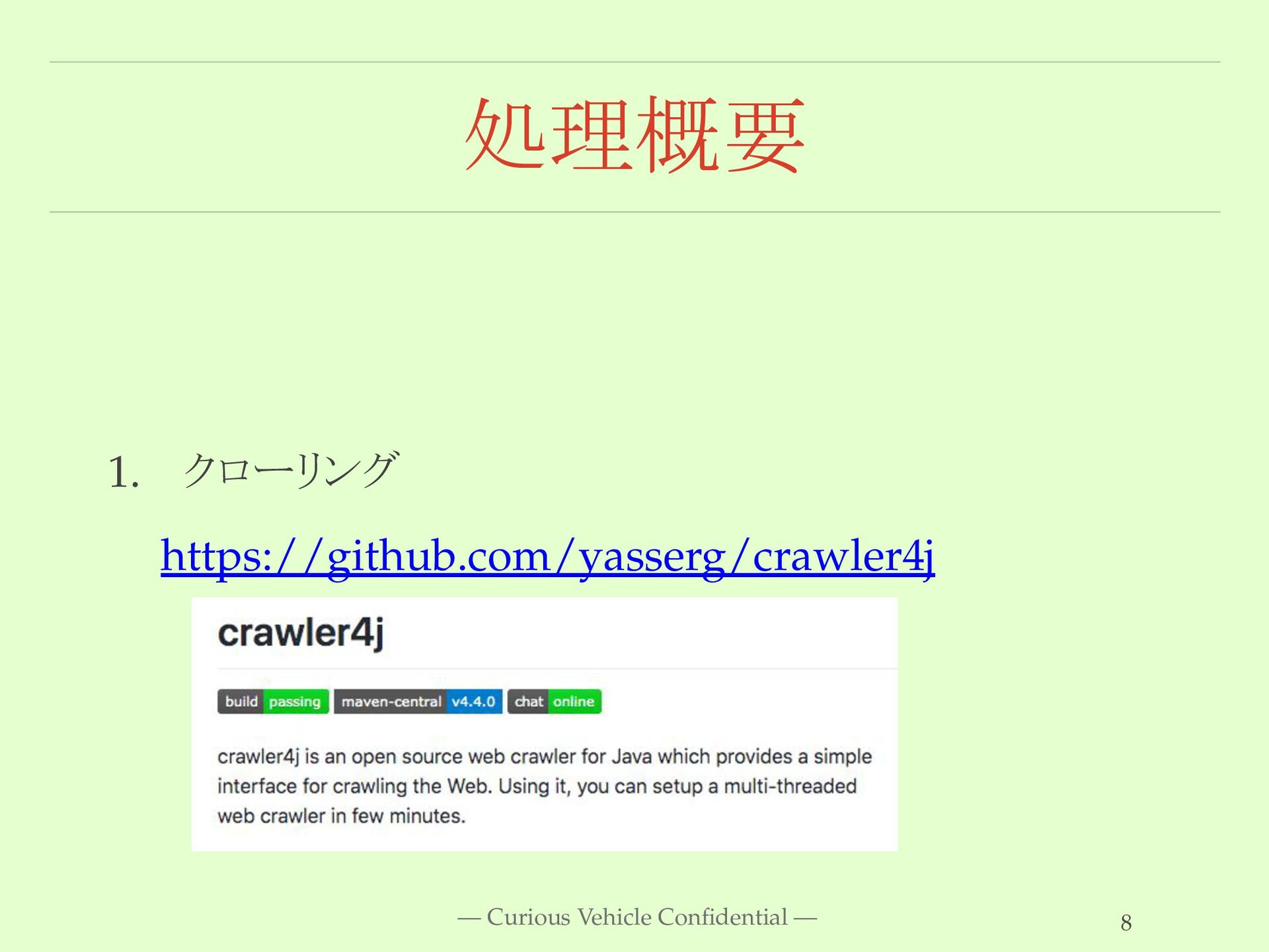 処理概要 1. クローリング https://github.com/yasserg/crawler4j — Curious Vehicle Confidential — 8