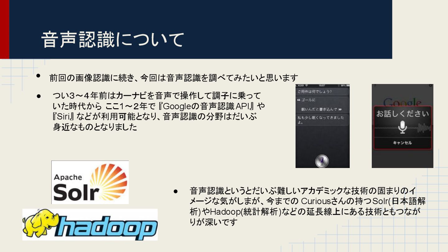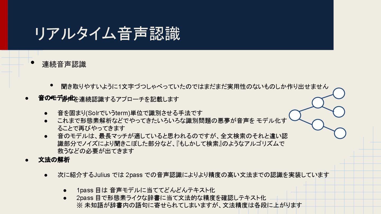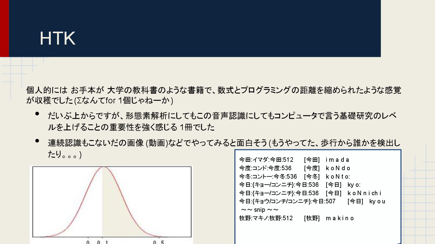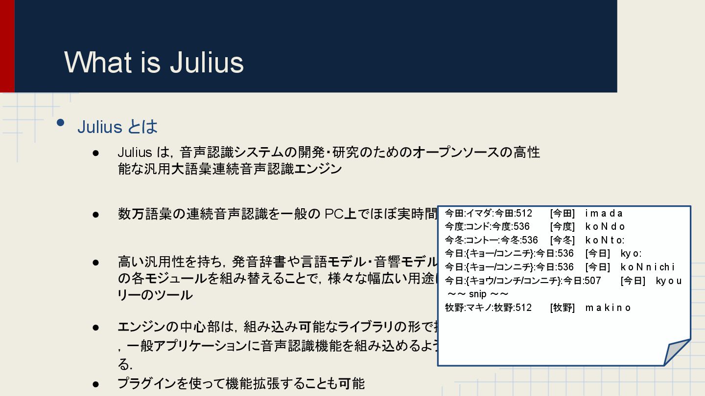 • 数万語彙の連続音声認識を一般の PC上でほぼ実時間で実行可能 • 高い汎用性を持ち,発音辞書や言語モデル・音響モデルなどの音声認識 の各モジュールを組み替えることで,様々な幅広い用途に応用ができるフ リーのツール • エンジンの中心部は,組み込み可能なライブラリの形で提供されており ,一般アプリケーションに音声認識機能を組み込めるよう設計されてい る. • プラグインを使って機能拡張することも可能 今田:イマダ:今田:512 [今田] i m a d a 今度:コンド:今度:536 [今度] k o N d o 今冬:コントー:今冬:536 [今冬] k o N t o: 今日:{キョー/コンニチ}:今日:536 [今日] ky o: 今日:{キョー/コンニチ}:今日:536 [今日] k o N n i ch i 今日:{キョウ/コンチ/コンニチ}:今日:507 [今日] ky o u ~~ snip ~~ 牧野:マキノ:牧野:512 [牧野] m a k i n o