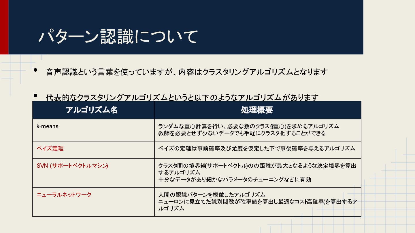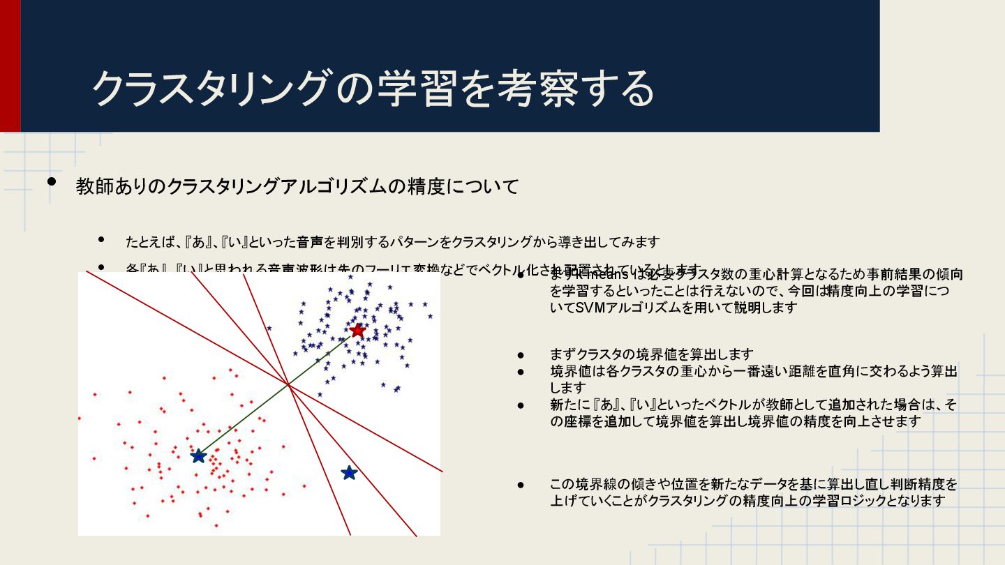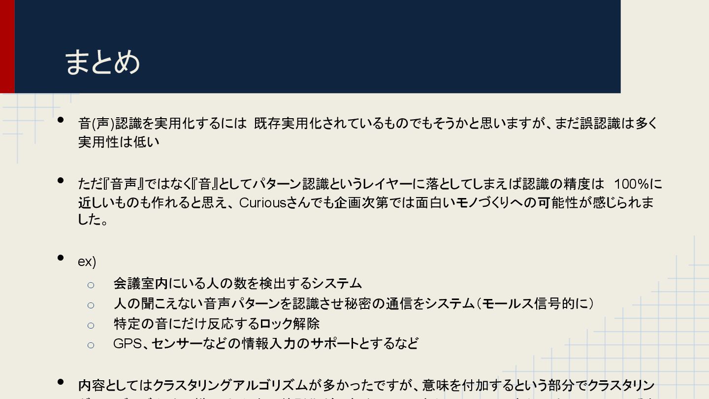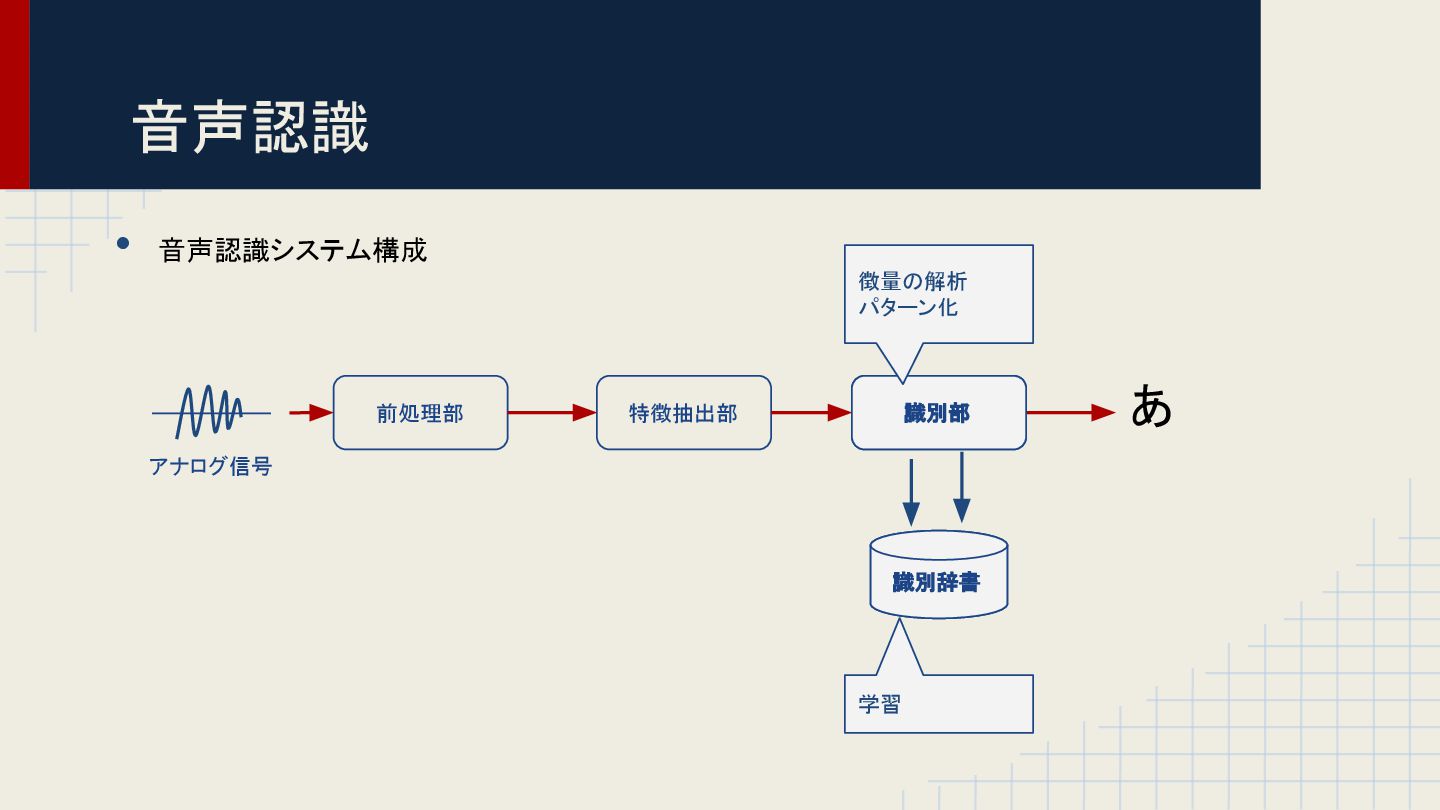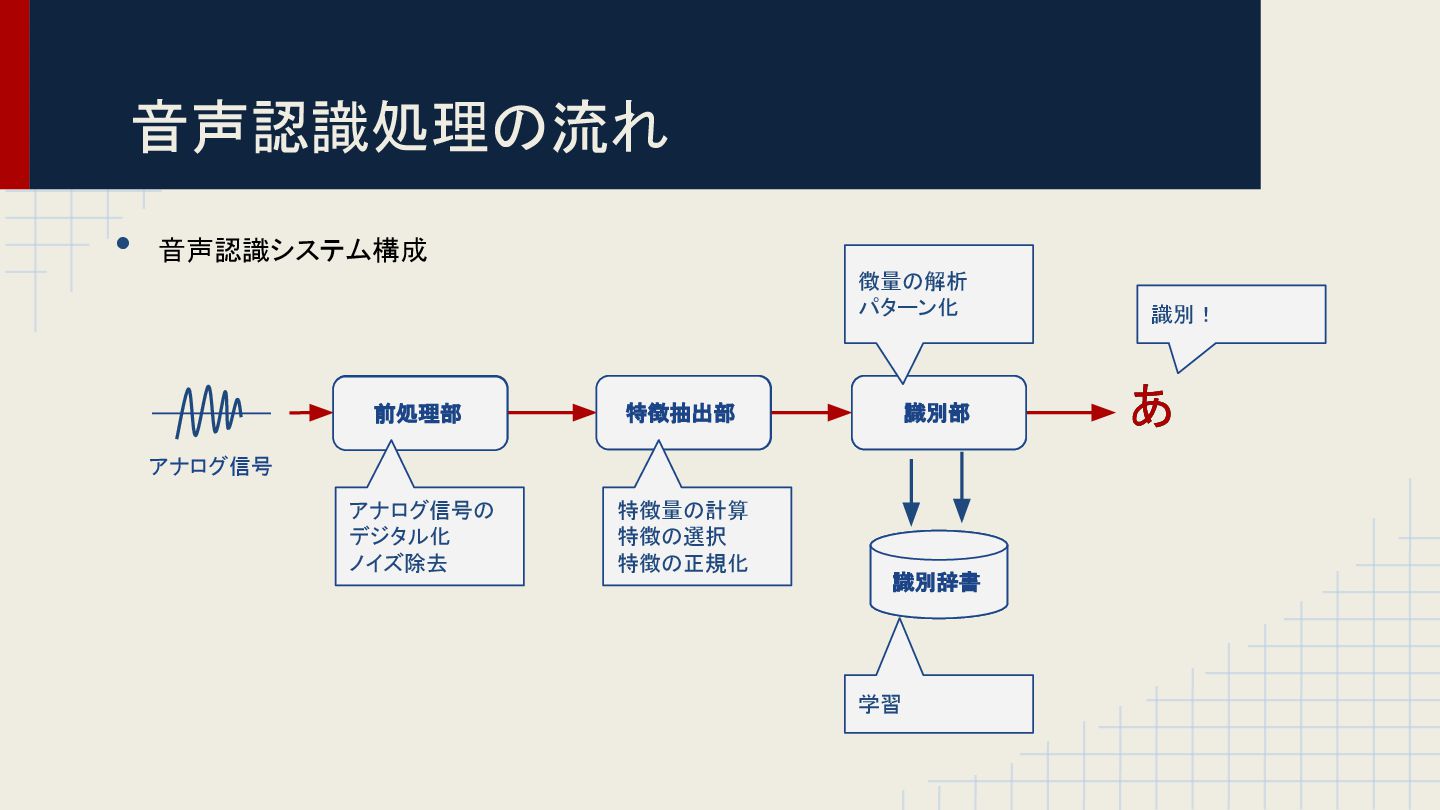 • 数万語彙の連続音声認識を一般の PC上でほぼ実時間で実行可能 • 高い汎用性を持ち,発音辞書や言語モデル・音響モデルなどの音声認識 の各モジュールを組み替えることで,様々な幅広い用途に応用ができるフ リーのツール • エンジンの中心部は,組み込み可能なライブラリの形で提供されており ,一般アプリケーションに音声認識機能を組み込めるよう設計されてい る. • プラグインを使って機能拡張することも可能 今田:イマダ:今田:512 [今田] i m a d a 今度:コンド:今度:536 [今度] k o N d o 今冬:コントー:今冬:536 [今冬] k o N t o: 今日:{キョー/コンニチ}:今日:536 [今日] ky o: 今日:{キョー/コンニチ}:今日:536 [今日] k o N n i ch i 今日:{キョウ/コンチ/コンニチ}:今日:507 [今日] ky o u ~~ snip ~~ 牧野:マキノ:牧野:512 [牧野] m a k i n o