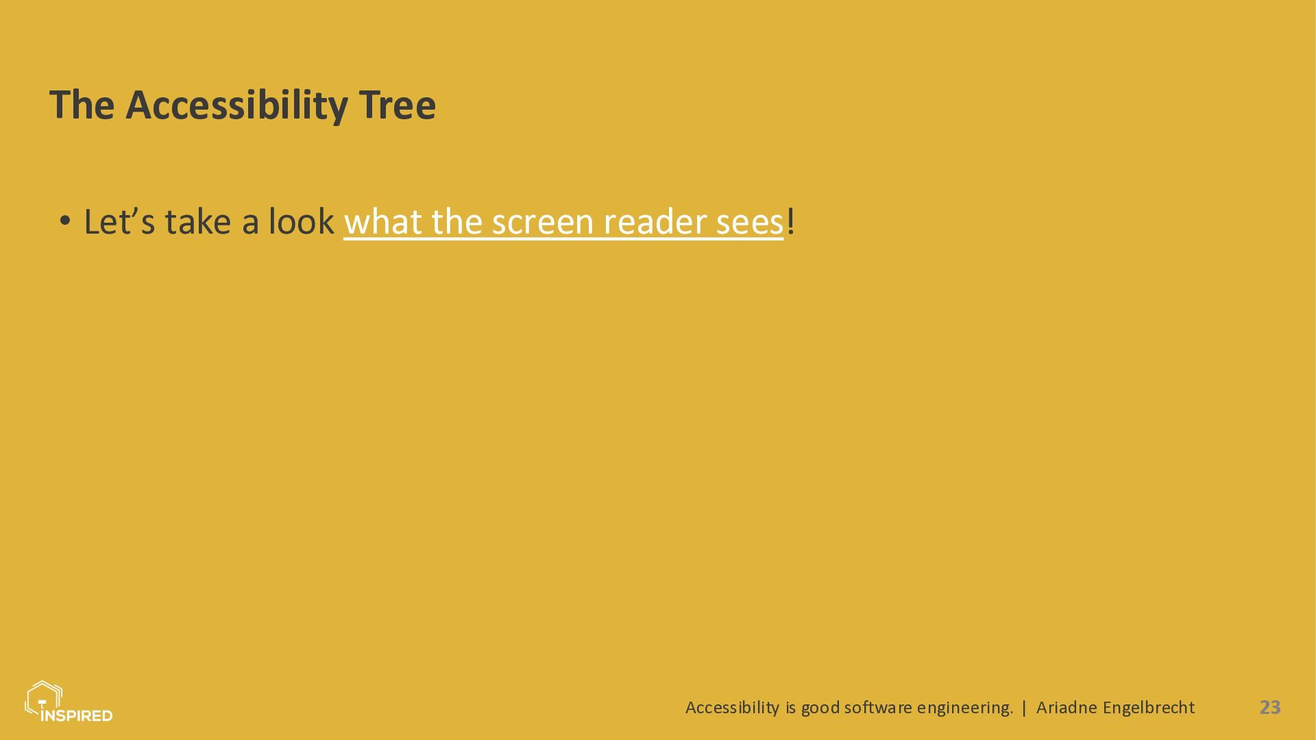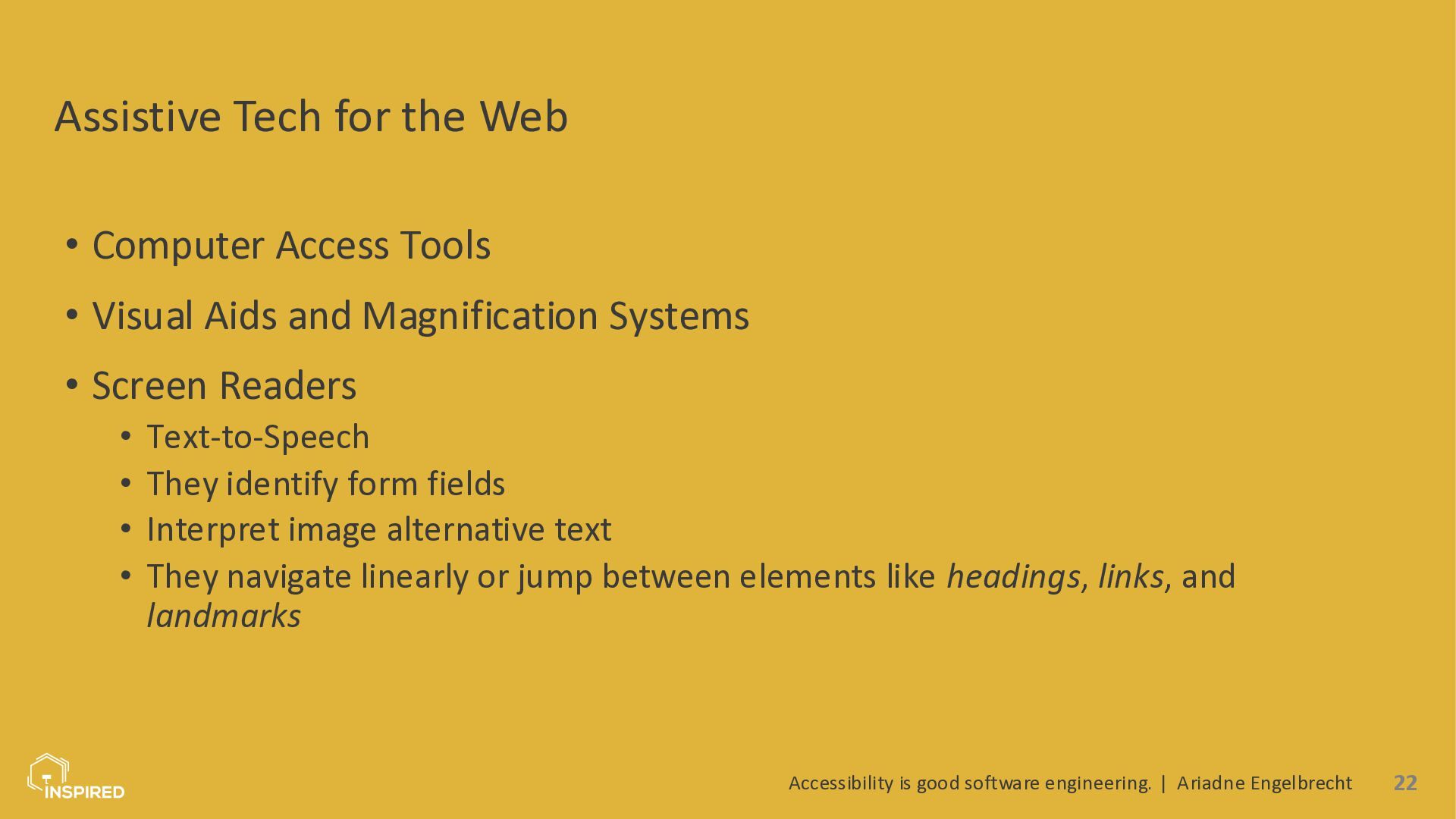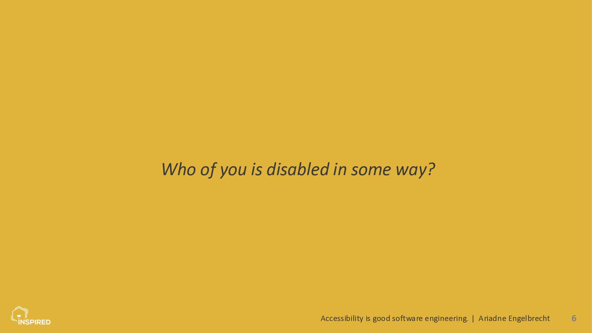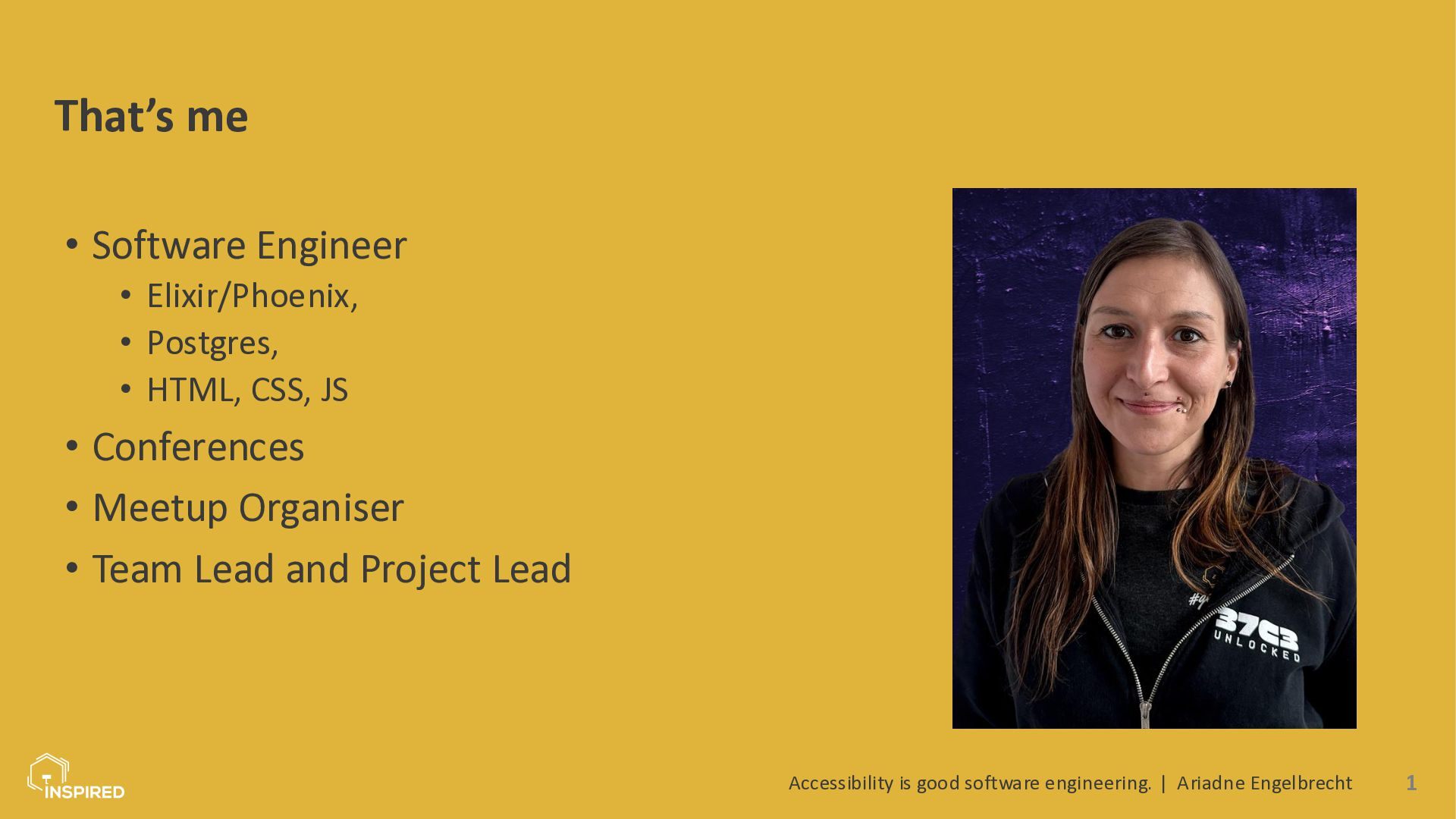 In this talk, we look at accessibility from a software engineering perspective. I will introduce the most common types of disabilities and assistive technologies, then show how they map to concrete engineering practices across the stack: semantics (and ARIA) in the frontend, accessible design systems, error message design, and test automation for accessibility. Attendees will leave with a practical checklist they can use in coding and code reviews.