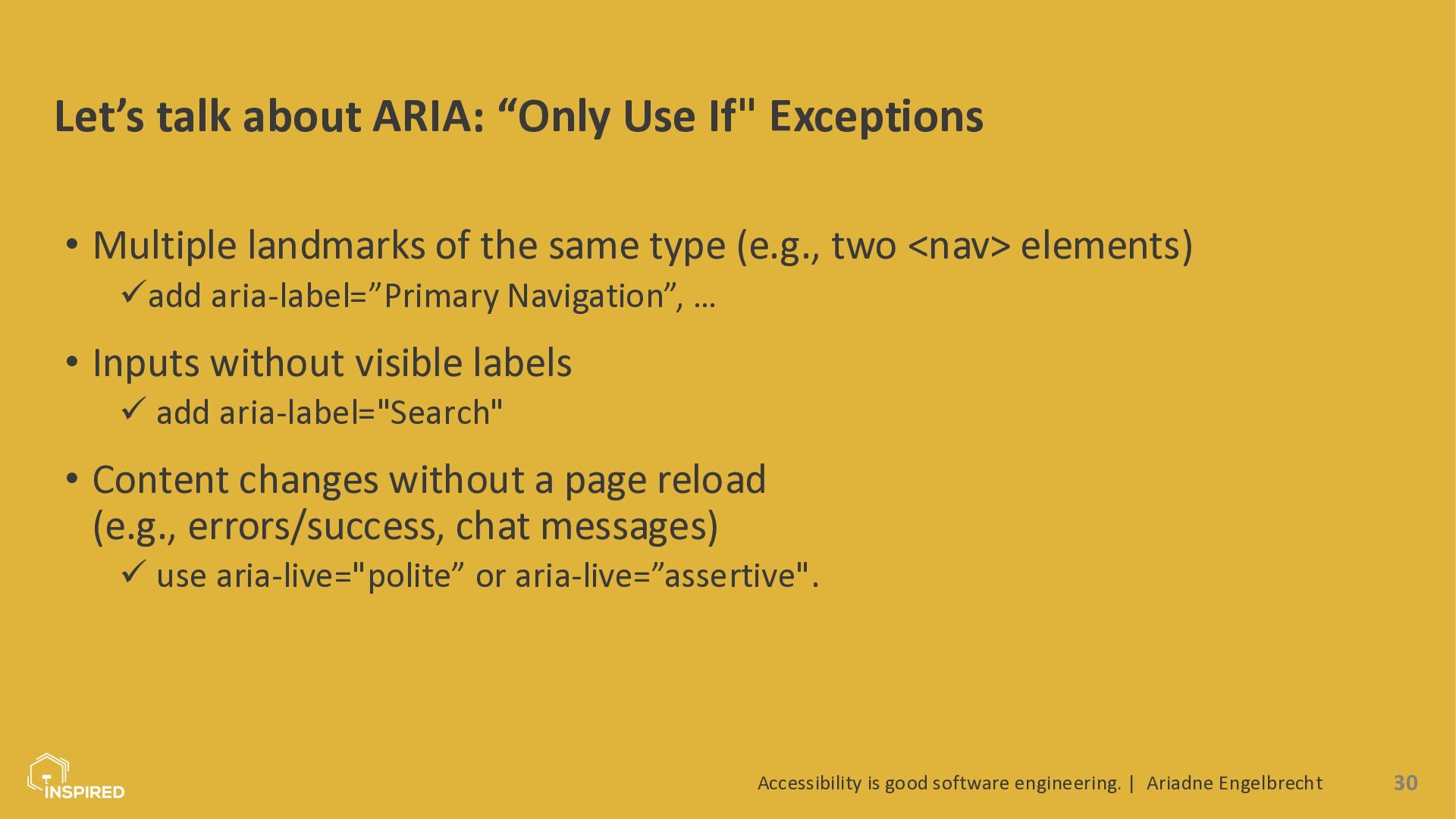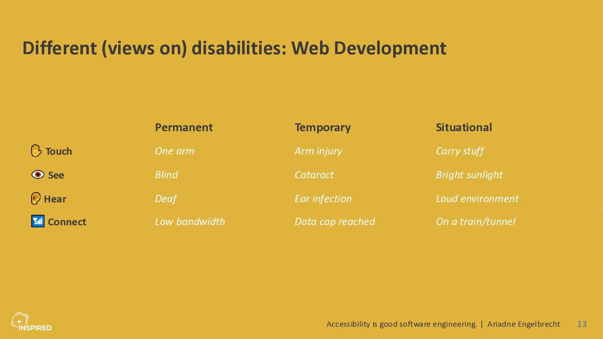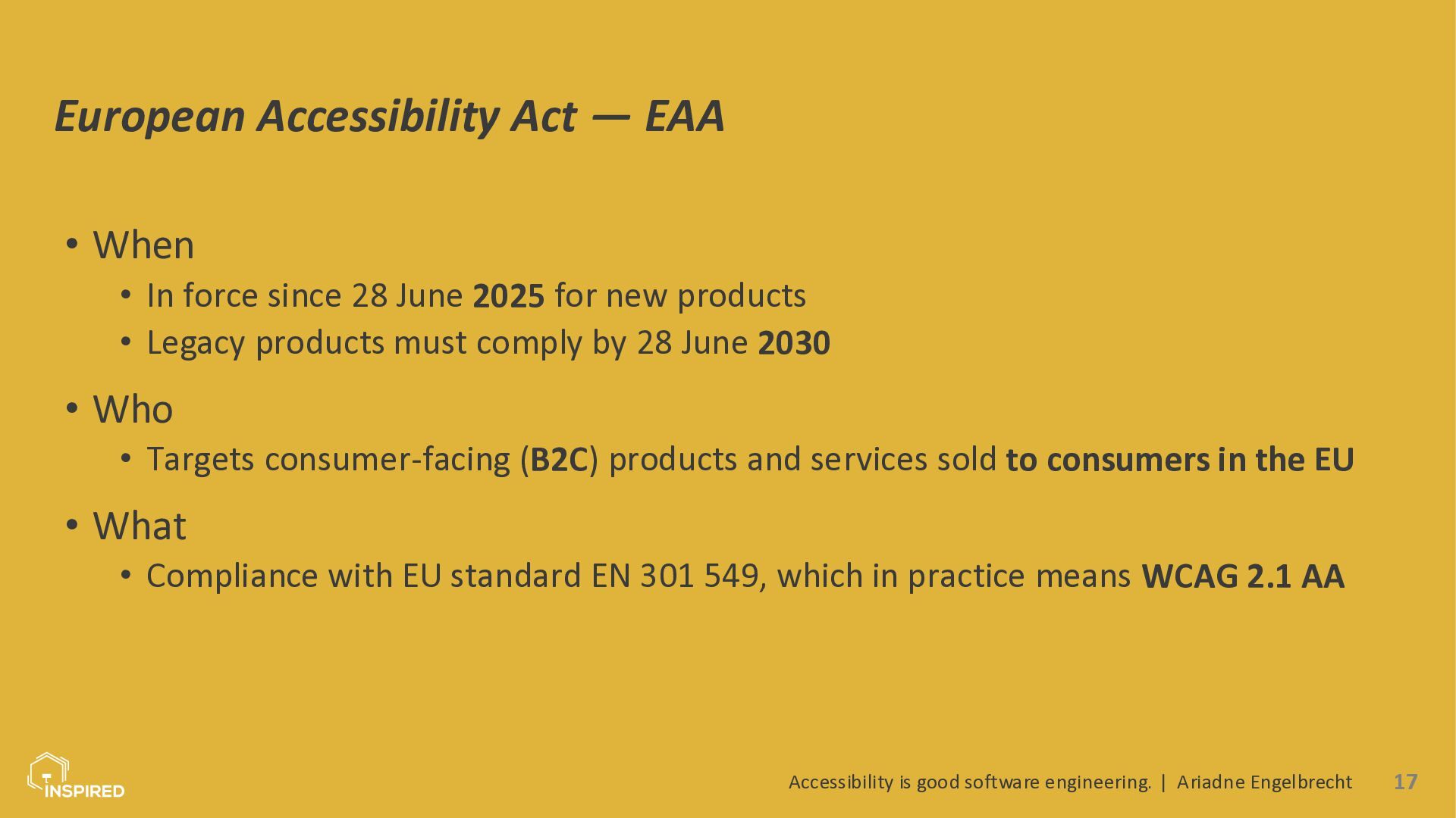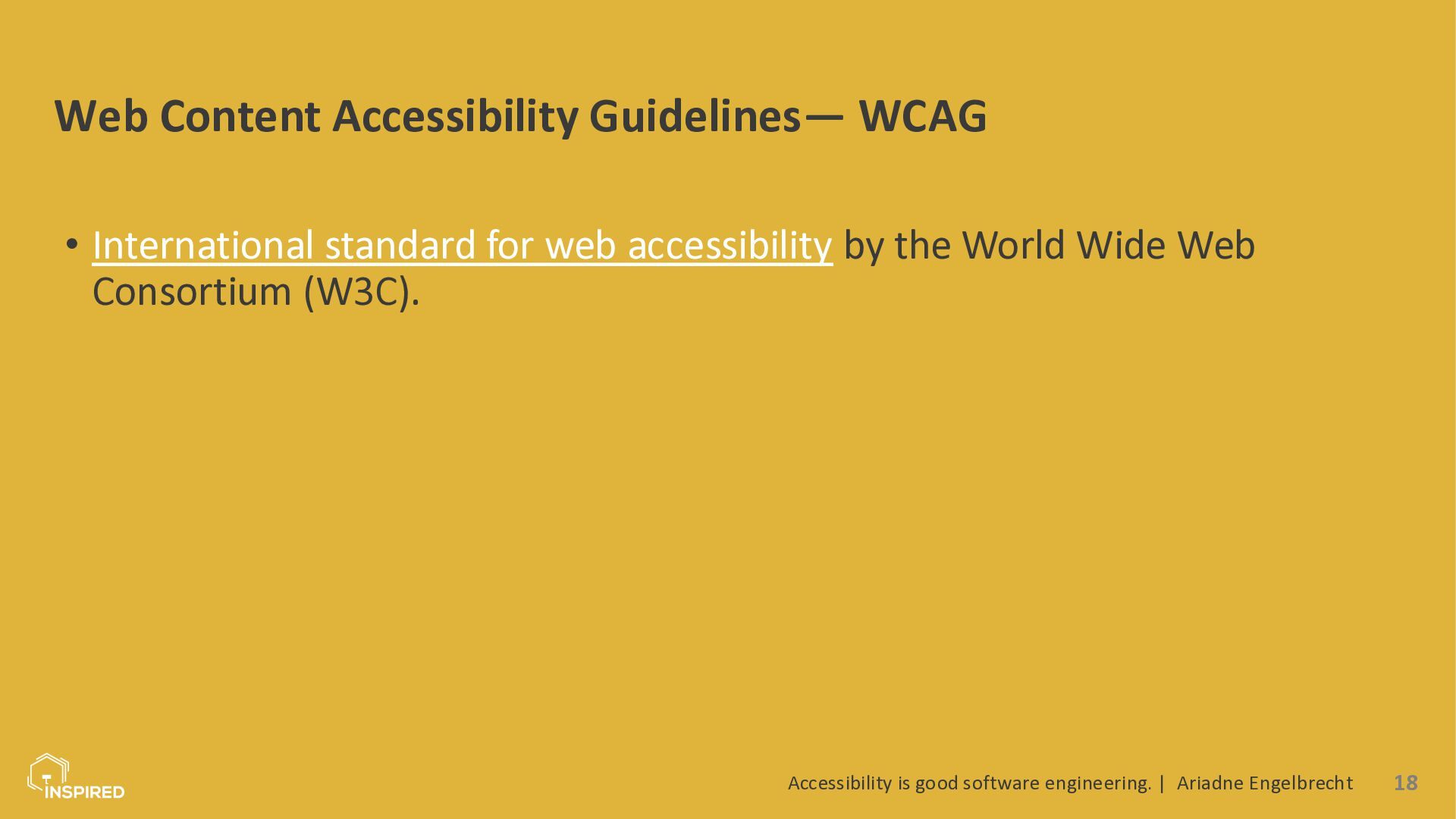 In this talk, we look at accessibility from a software engineering perspective. I will introduce the most common types of disabilities and assistive technologies, then show how they map to concrete engineering practices across the stack: semantics (and ARIA) in the frontend, accessible design systems, error message design, and test automation for accessibility. Attendees will leave with a practical checklist they can use in coding and code reviews.