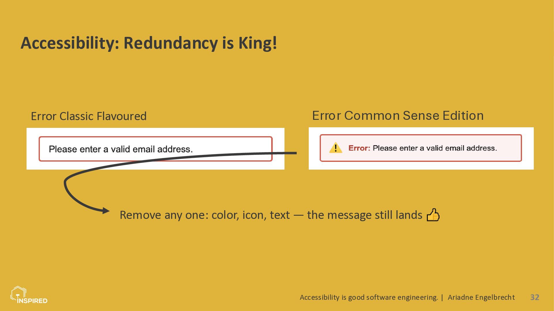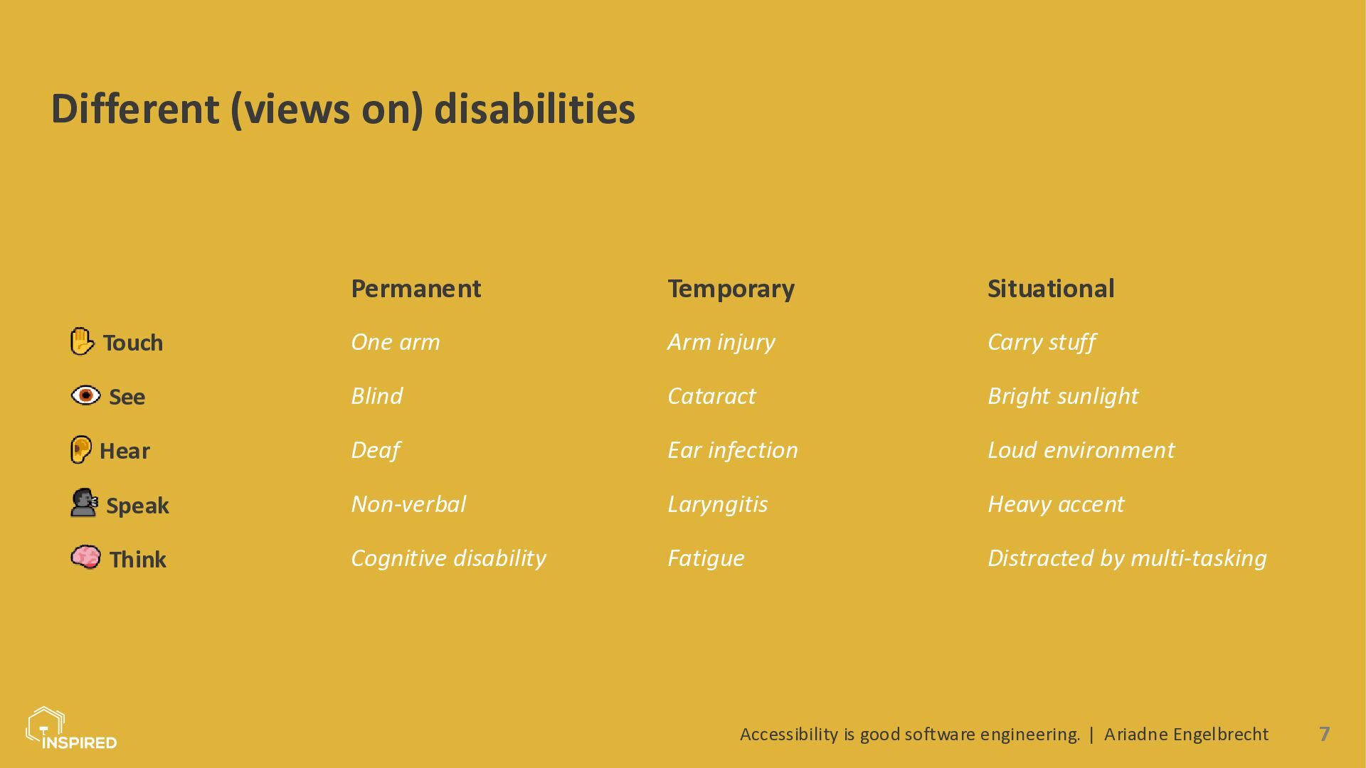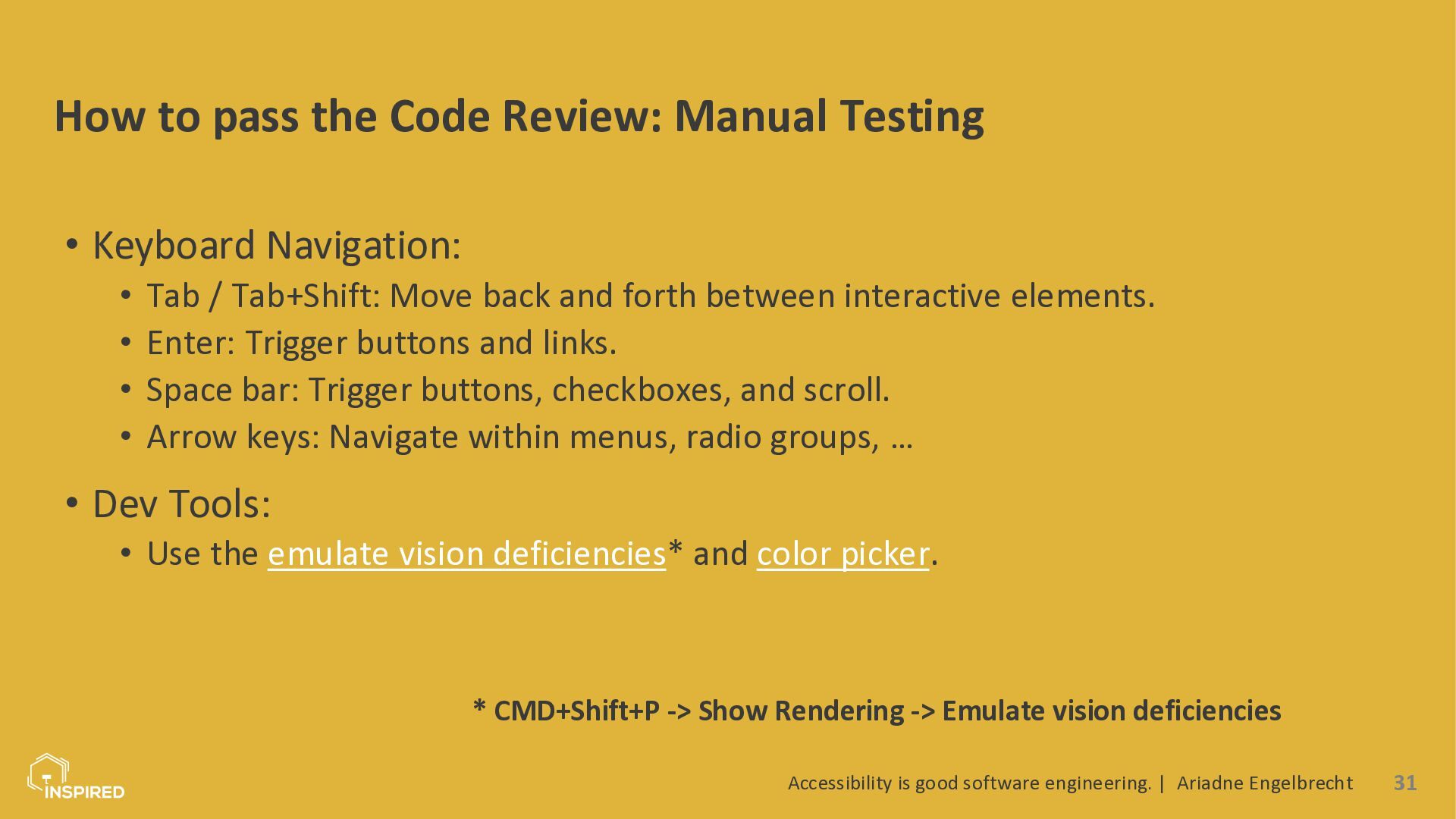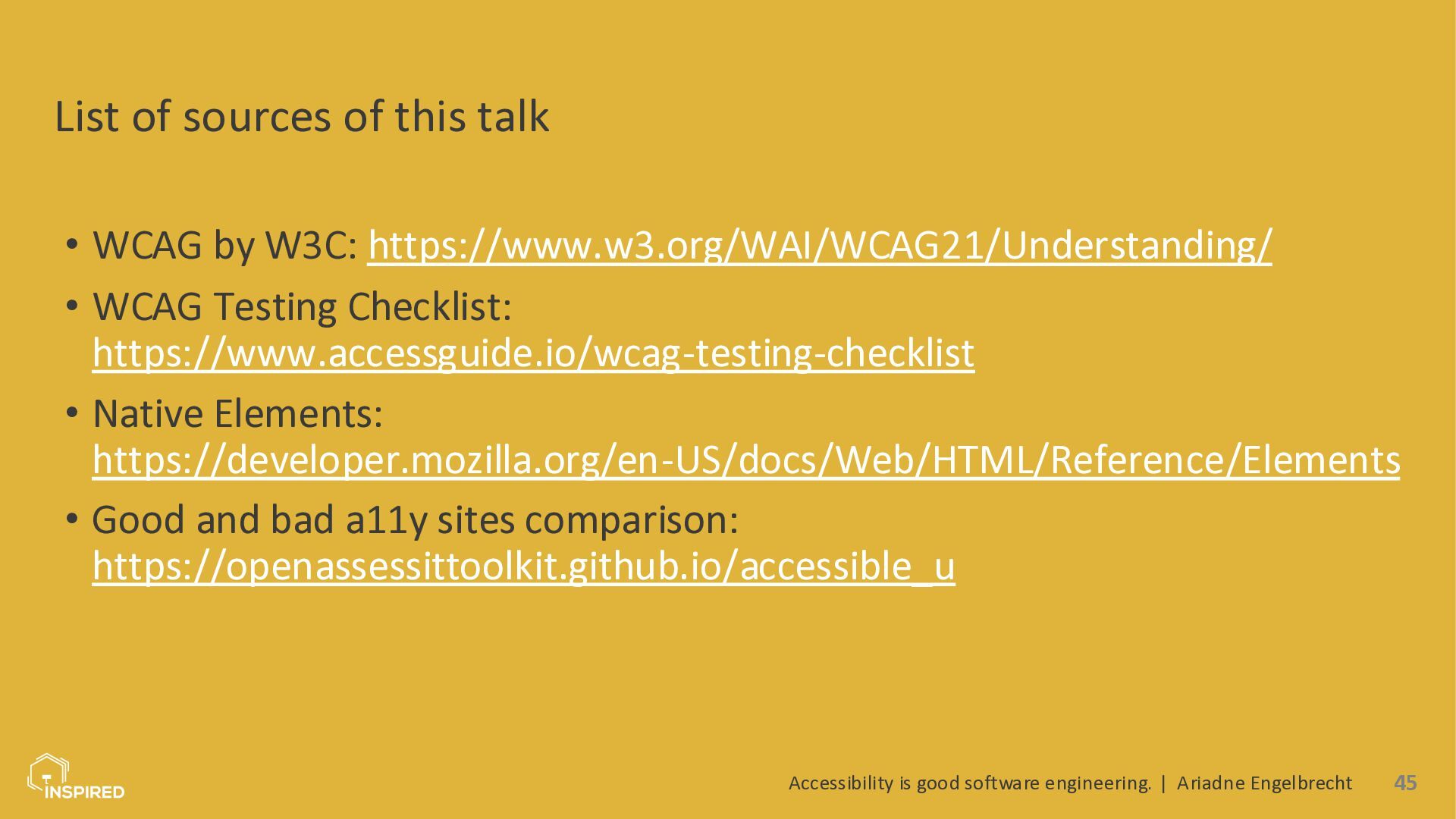 In this talk, we look at accessibility from a software engineering perspective. I will introduce the most common types of disabilities and assistive technologies, then show how they map to concrete engineering practices across the stack: semantics (and ARIA) in the frontend, accessible design systems, error message design, and test automation for accessibility. Attendees will leave with a practical checklist they can use in coding and code reviews.
