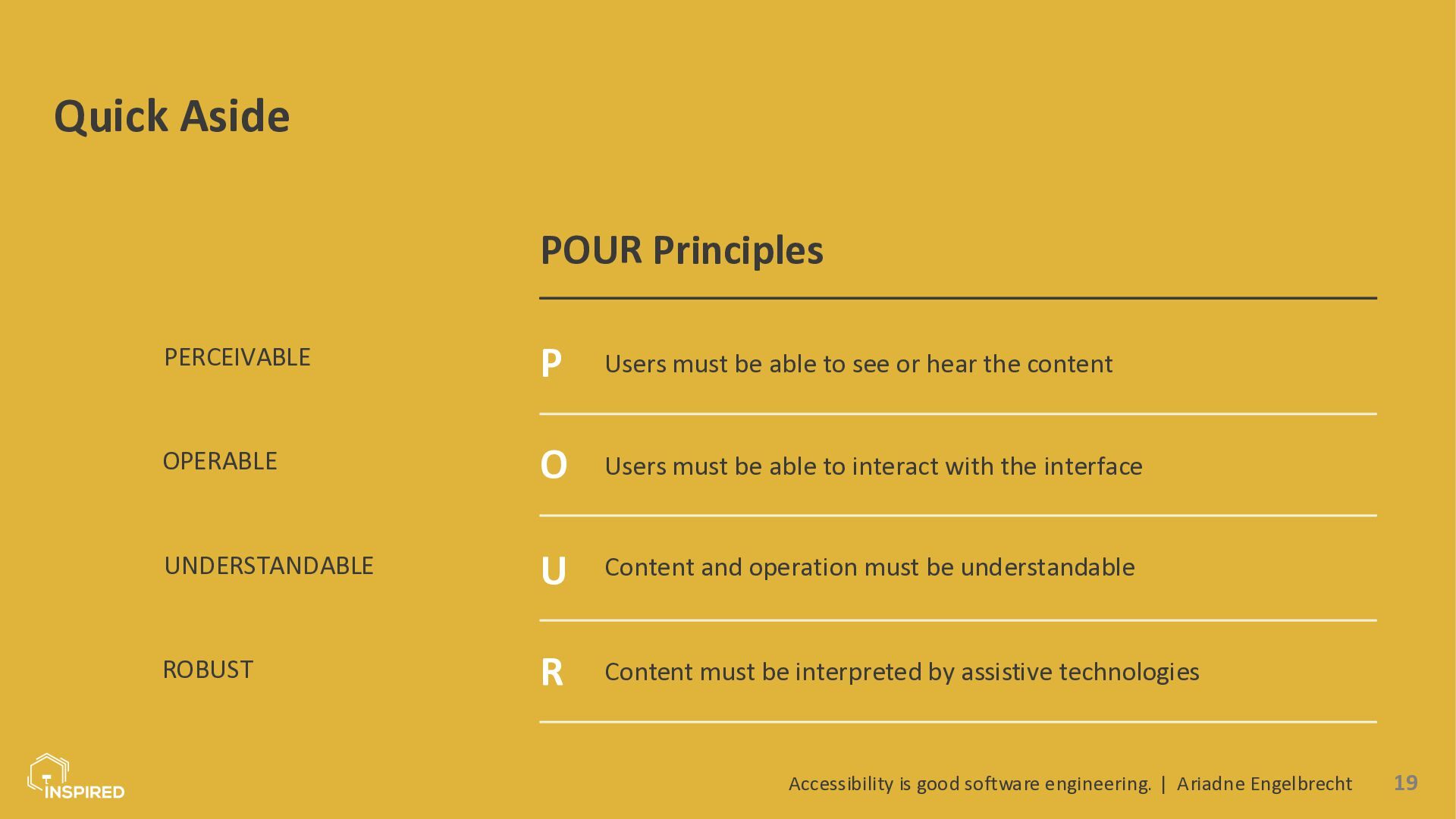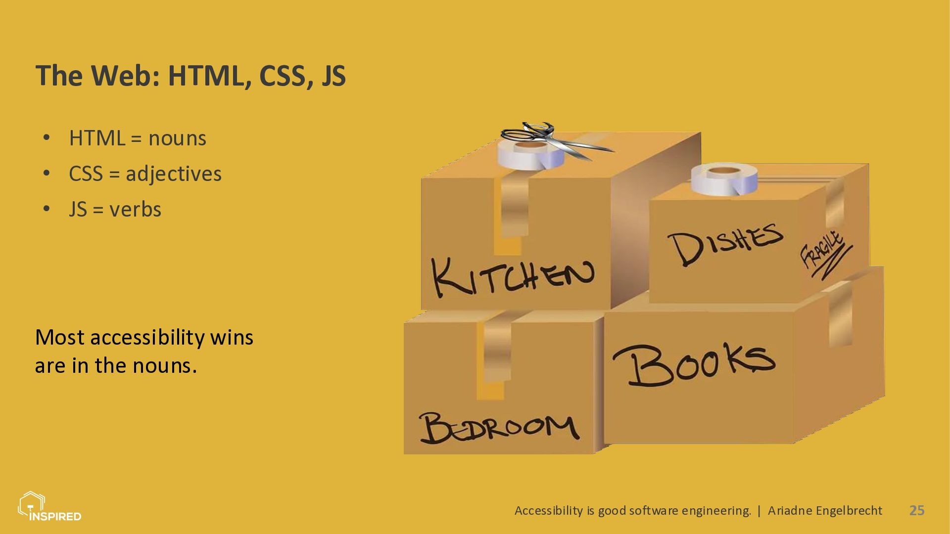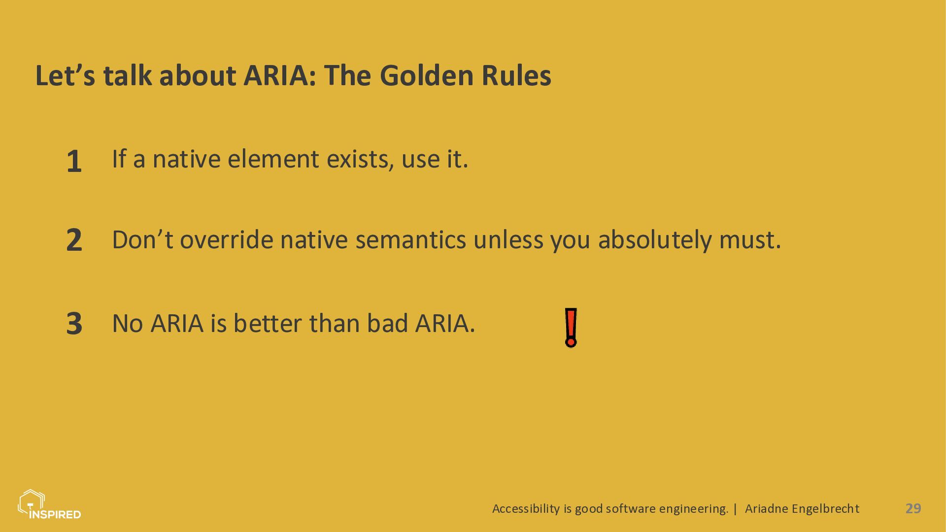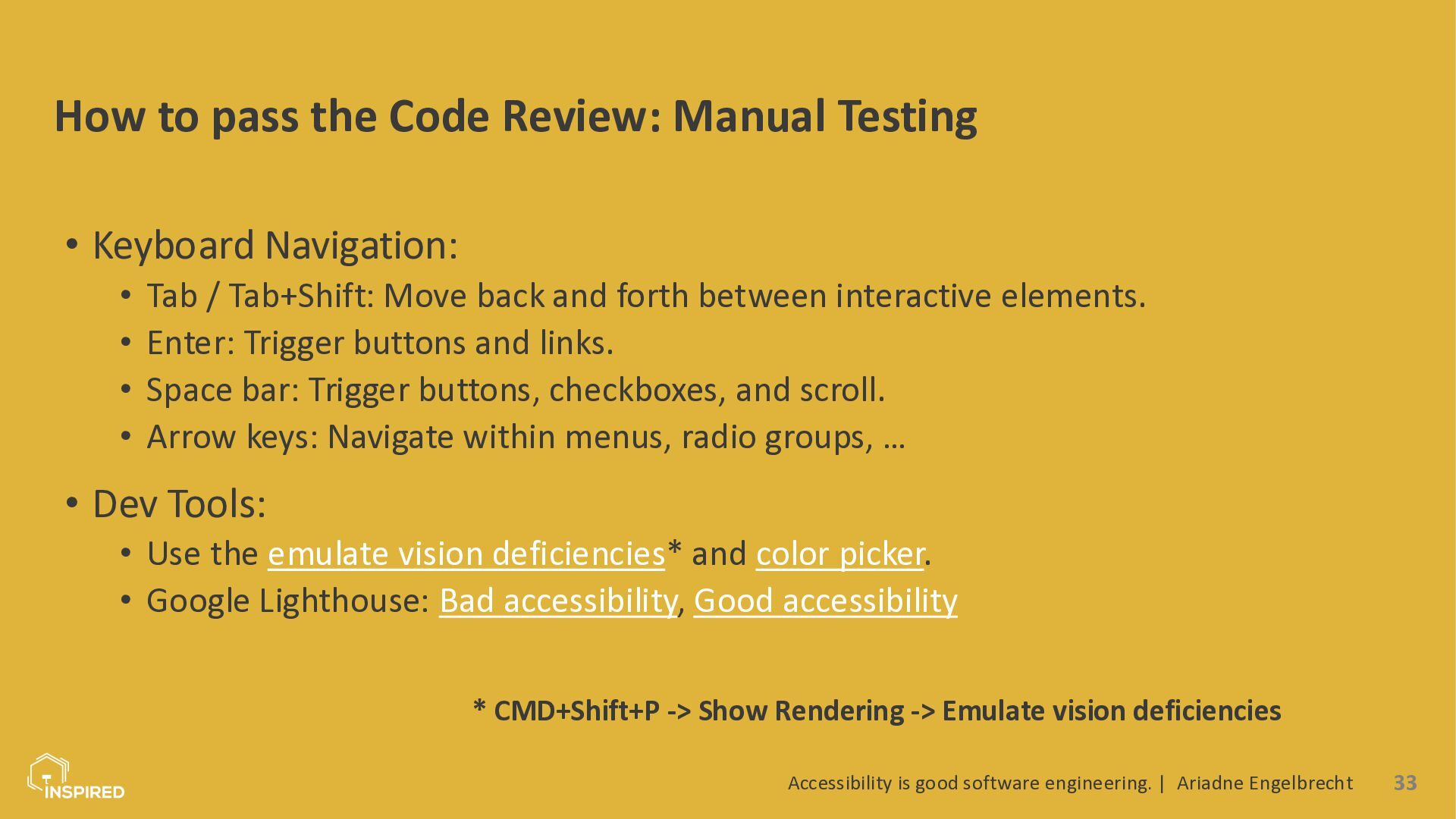 In this talk, we look at accessibility from a software engineering perspective. I will introduce the most common types of disabilities and assistive technologies, then show how they map to concrete engineering practices across the stack: semantics (and ARIA) in the frontend, accessible design systems, error message design, and test automation for accessibility. Attendees will leave with a practical checklist they can use in coding and code reviews.