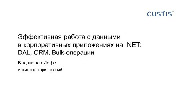 использования ORM сломано немало копий. Доклад будет посвящен нашим подходам к работе с данными. Вы узнаете, какие возможности работы с множеством данных предоставляют различные провайдеры ADO.NET, зачем вам Batch- и Bulk-операции, как шутя обрабатывать десятки и сотни миллионов записей, что такое гибридные DAL и зачем мы используем три ORM в одном продукте. 2