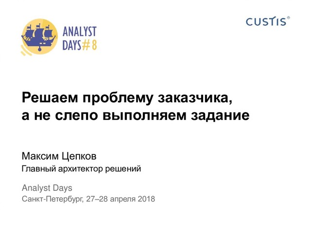 к что. Но, не зная зачем, часто не удается получить работающий результат Я расскажу о практиках, позволяющих избежать ловушек на пути от замысла к воплощению Покажу применение этих практик на примерах из реальных проектов Ограничения доклада Рассказ будет про разработку на заказ, а не продуктовую Примеры – про системы повышения эффективности Применяет ли практики аналитик или другие – не рассматриваем О чем будет доклад 3/32