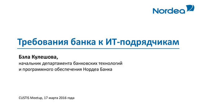 Выступление Бэлы Кулешовой, начальника департамента банковских технологий и программного обеспечения Нордеа Банка, на профессиональной встрече CUSTIS Meetup: Управление ИТ-проектами в банках (17 марта 2016 года, Москва).