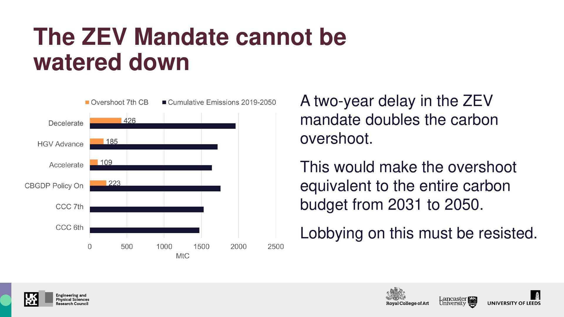 overshoot. This would make the overshoot equivalent to the entire carbon budget from 2031 to 2050. Lobbying on this must be resisted. The ZEV Mandate cannot be watered down