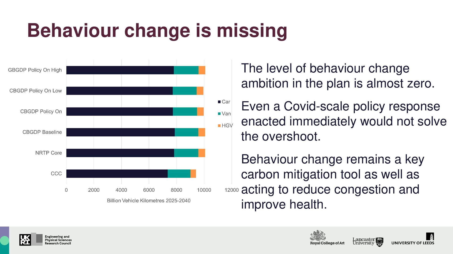 almost zero. Even a Covid-scale policy response enacted immediately would not solve the overshoot. Behaviour change remains a key carbon mitigation tool as well as acting to reduce congestion and improve health. Behaviour change is missing